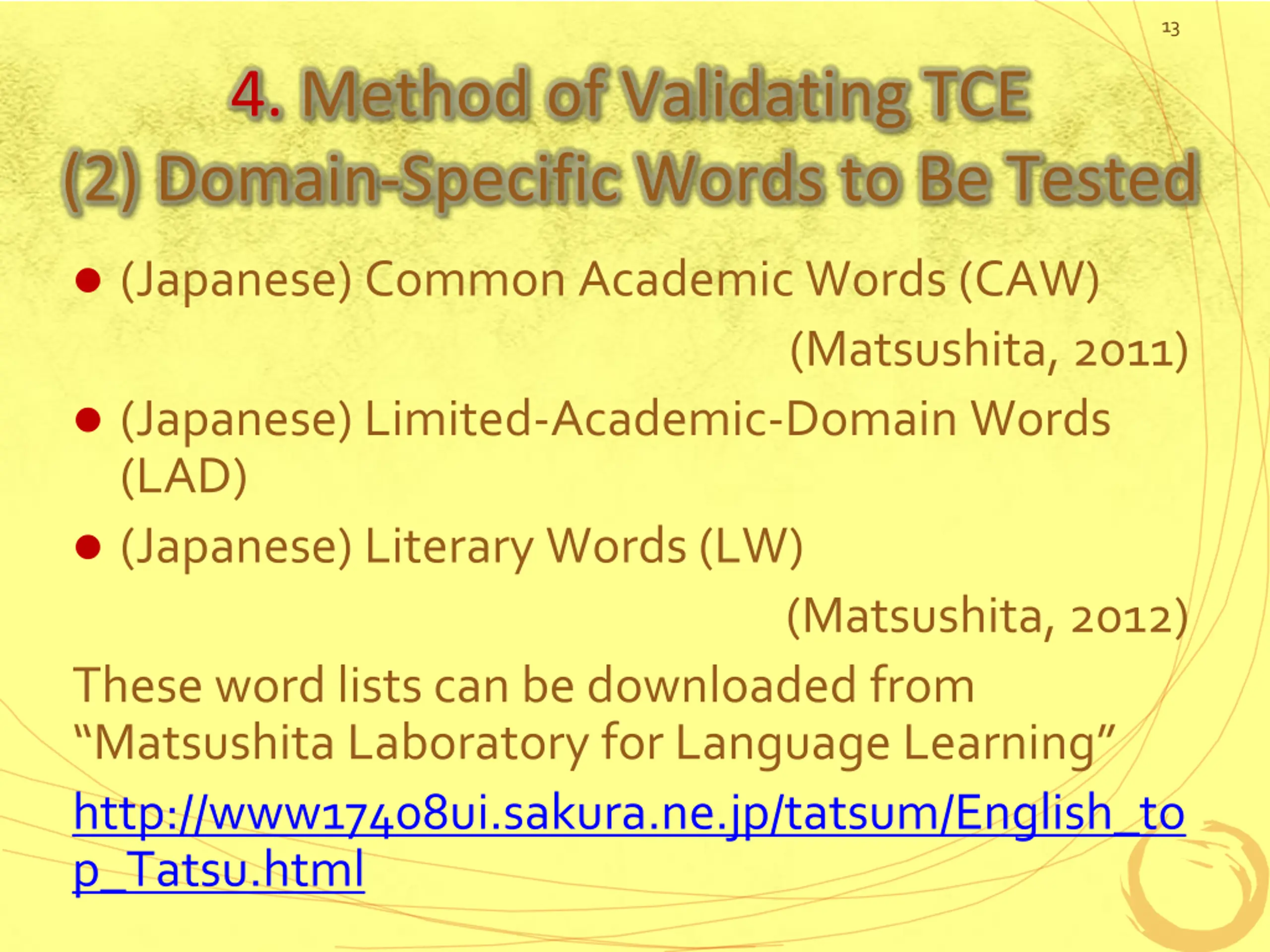 13 4. Method of Validating TCE (2) Domain-Specific Words to Be Tested (Japanese) Common Academic Words (CAW) (Matsushita, 2011) (Japanese) Limited-Academic-Domain Words (LAD) (Japanese) Literary Words (LW) (Matsushita, 2012) These word lists can be downloaded from Matsushita Laboratory for Language Learning http://www17408ui.sakura.ne.jp/tatsum/English_to p_Tatsu.html
