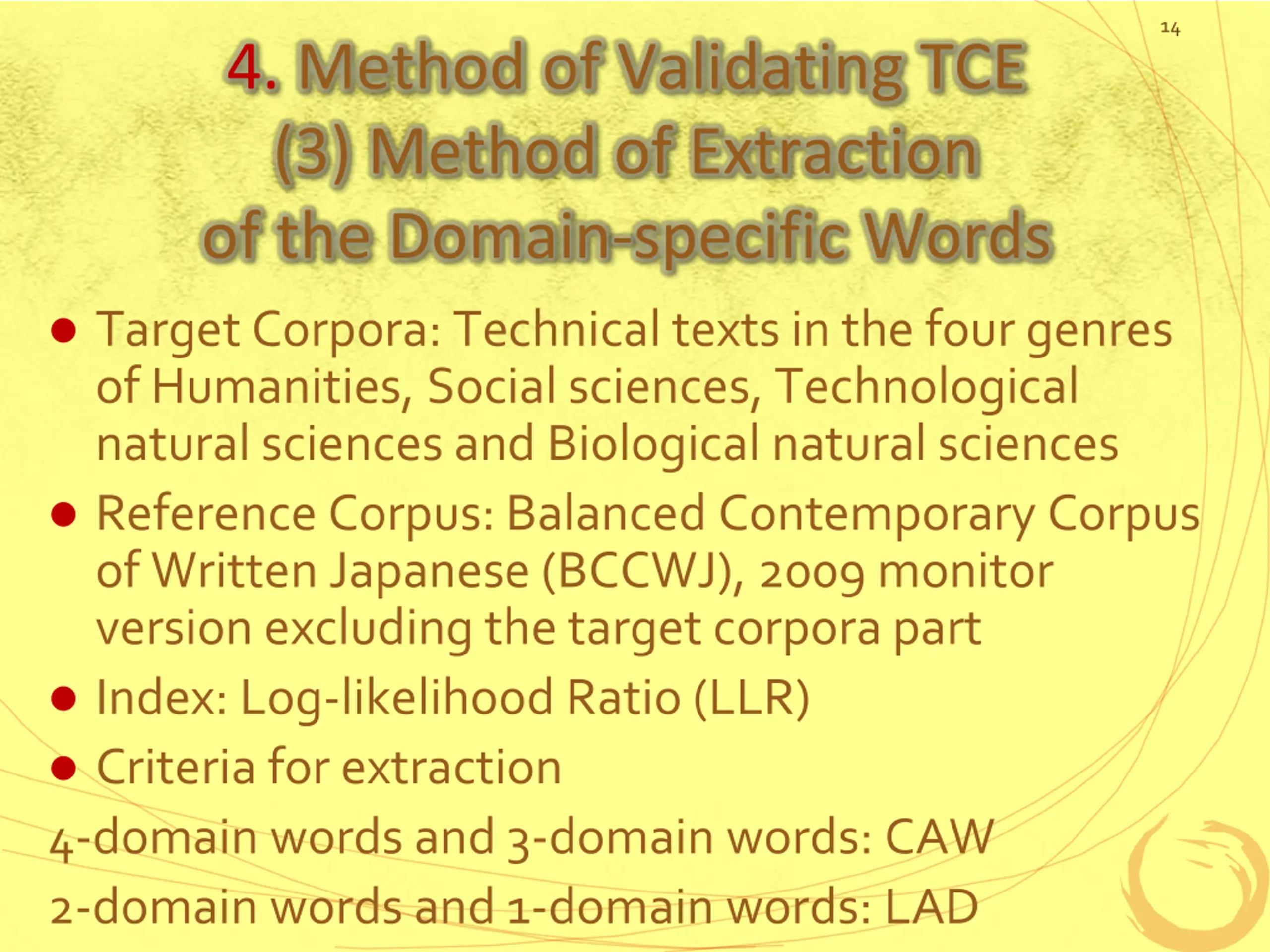 14 4. Method of Validating TCE (3) Method of Extraction of the Domain-specific Words Target Corpora: Technical texts in the four genres of Humanities, Social sciences, Technological natural sciences and Biological natural sciences Reference Corpus: Balanced Contemporary Corpus of Written Japanese (BCCWJ), 2009 monitor version excluding the target corpora part Index: Log-likelihood Ratio (LLR) Criteria for extraction 4-domain words and 3-domain words: CAW 2-domain words and 1-domain words: LAD