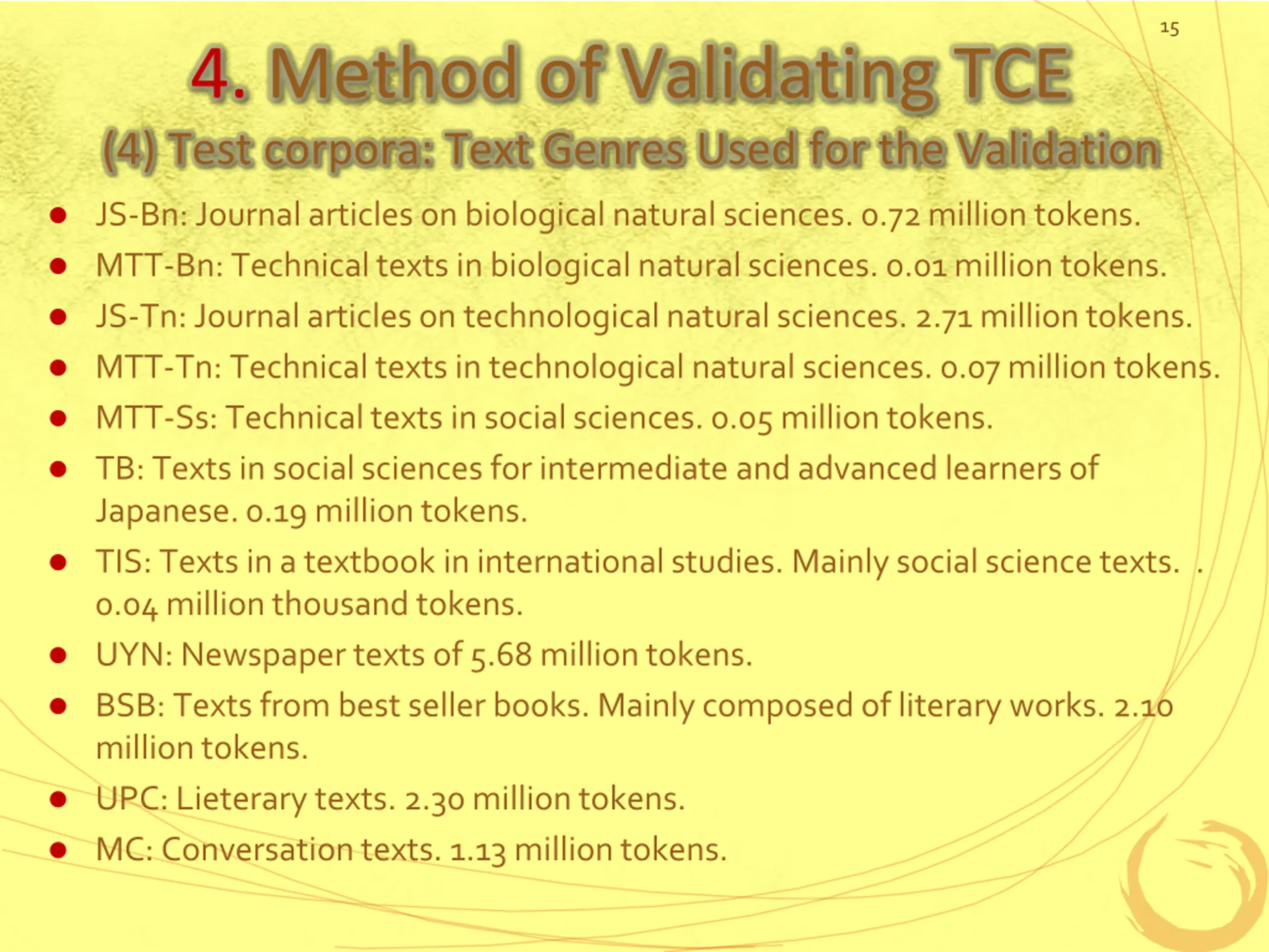 15 4. Method of Validating TCE (4) Test corpora: Text Genres Used for the Validation JS-Bn: Journal articles on biological natural sciences. 0.72 million tokens. MTT-Bn: Technical texts in biological natural sciences. 0.01 million tokens. JS-Tn: Journal articles on technological natural sciences. 2.71 million tokens. MTT-Tn: Technical texts in technological natural sciences. 0.07 million tokens. MTT-Ss: Technical texts in social sciences. 0.05 million tokens. TB: Texts in social sciences for intermediate and advanced learners of Japanese. 0.19 million tokens. TIS: Texts in a textbook in international studies. Mainly social science texts. . 0.04 million thousand tokens. UYN: Newspaper texts of 5.68 million tokens. BSB: Texts from best seller books. Mainly composed of literary works. 2.10 million tokens. UPC: Lieterary texts. 2.30 million tokens. MC: Conversation texts. 1.13 million tokens.