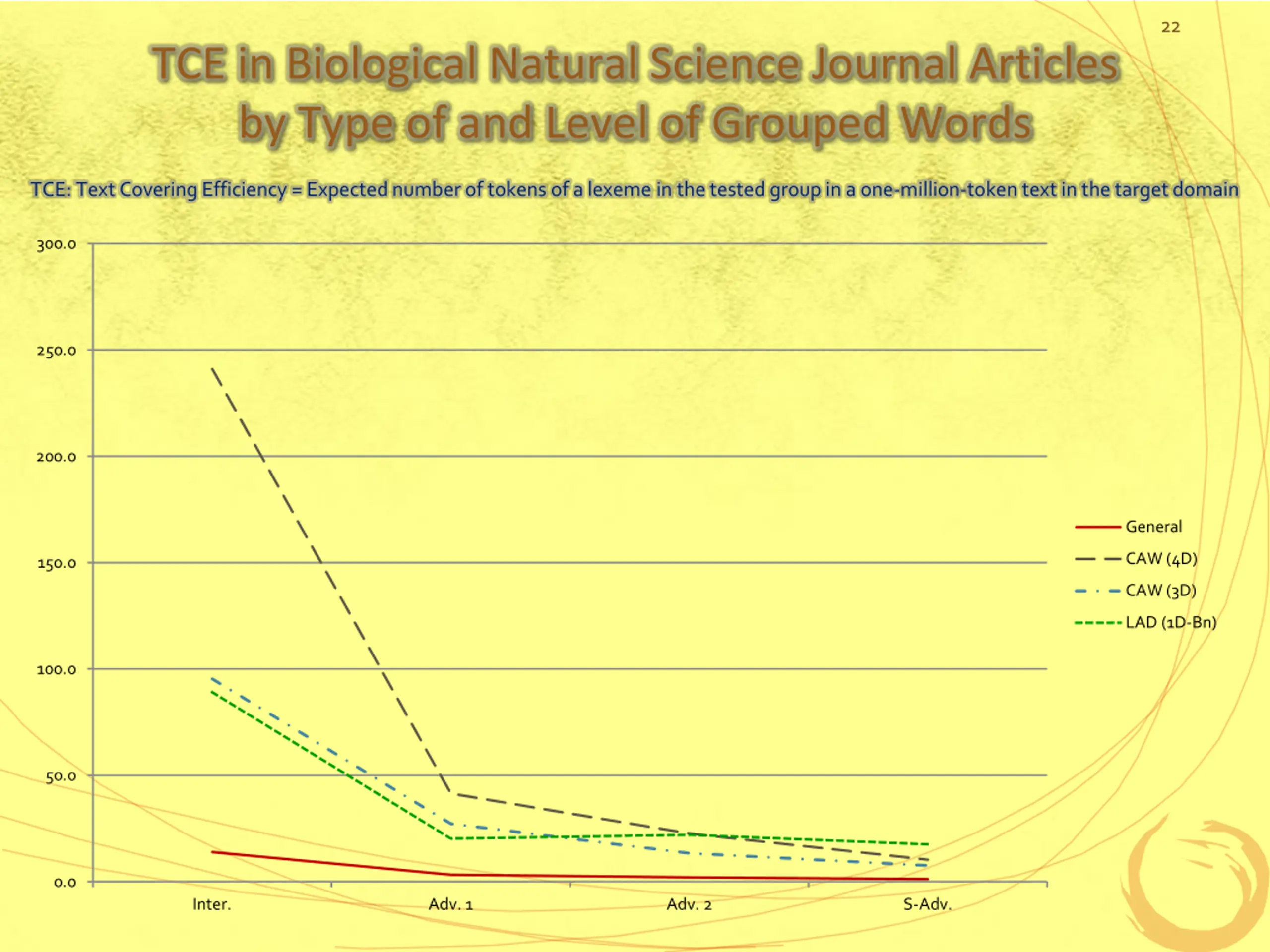 21 TCE in Biological Natural Science Journal Articles by Type of and Level of Grouped Words TCE: Text Covering Efficiency = Expected number of tokens of a lexeme in the tested group in a one-million-token text in the target domain Basic Basic Inter. Inter. Adv. 1 Adv. 1 Adv. 2 Adv. 2 S-Adv. S-Adv. General CAW (4D) CAW (3D) LAD (1D-Bn) 495.6 1098.7 425.1 77.8 13.9 241.1 95.4 89.1 3.2 41.4 27.3 20.3 2.0 22.6 13.4 22.0 1.2 10.3 7.6 17.6