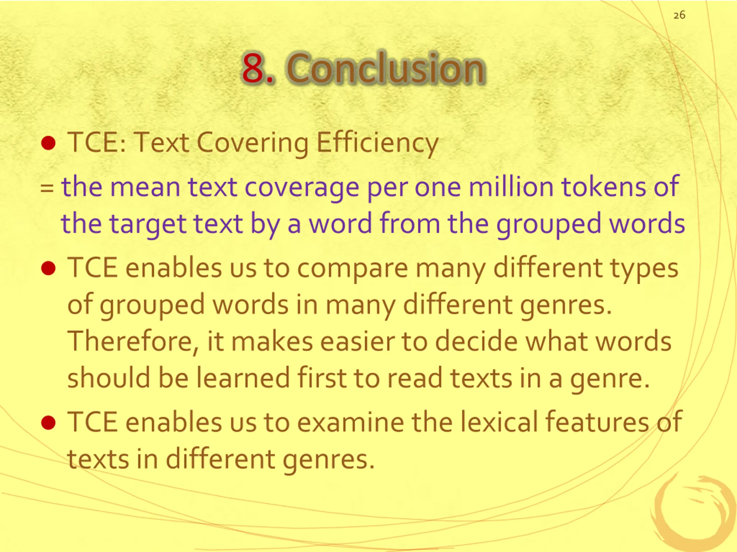 26 8. Conclusion TCE: Text Covering Efficiency = the mean text coverage per one million tokens of the target text by a word from the grouped words TCE enables us to compare many different types of grouped words in many different genres. Therefore, it makes easier to decide what words should be learned first to read texts in a genre. TCE enables us to examine the lexical features of texts in different genres.