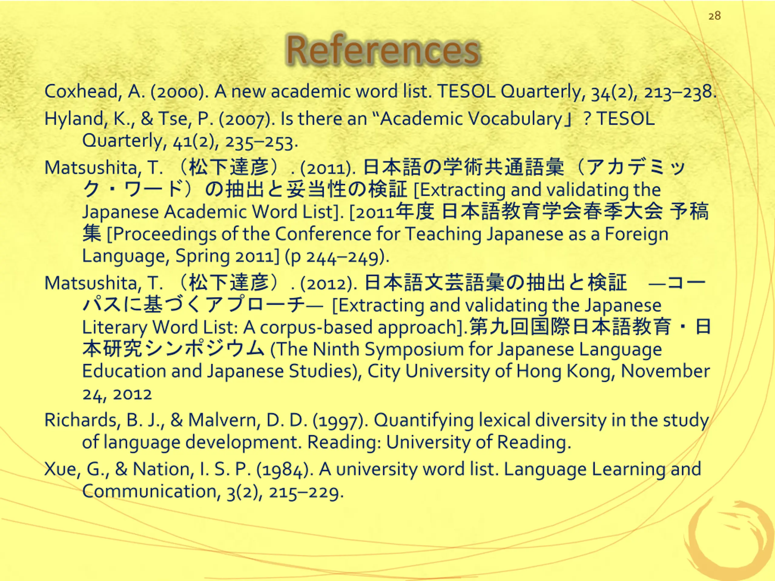 28 References Coxhead, A. (2000). A new academic word list. TESOL Quarterly, 34(2), 213 238. Hyland, K., & Tse, P. (2007). Is there an Academic Vocabulary ? TESOL Quarterly, 41(2), 235 253. Matsushita, T. . (2011). [Extracting and validating the Japanese Academic Word List]. [2011 [Proceedings of the Conference for Teaching Japanese as a Foreign Language, Spring 2011] (p 244 249). Matsushita, T. . (2012). [Extracting and validating the Japanese Literary Word List: A corpus-based approach]. (The Ninth Symposium for Japanese Language Education and Japanese Studies), City University of Hong Kong, November 24, 2012 Richards, B. J., & Malvern, D. D. (1997). Quantifying lexical diversity in the study of language development. Reading: University of Reading. Xue, G., & Nation, I. S. P. (1984). A university word list. Language Learning and Communication, 3(2), 215 229.
