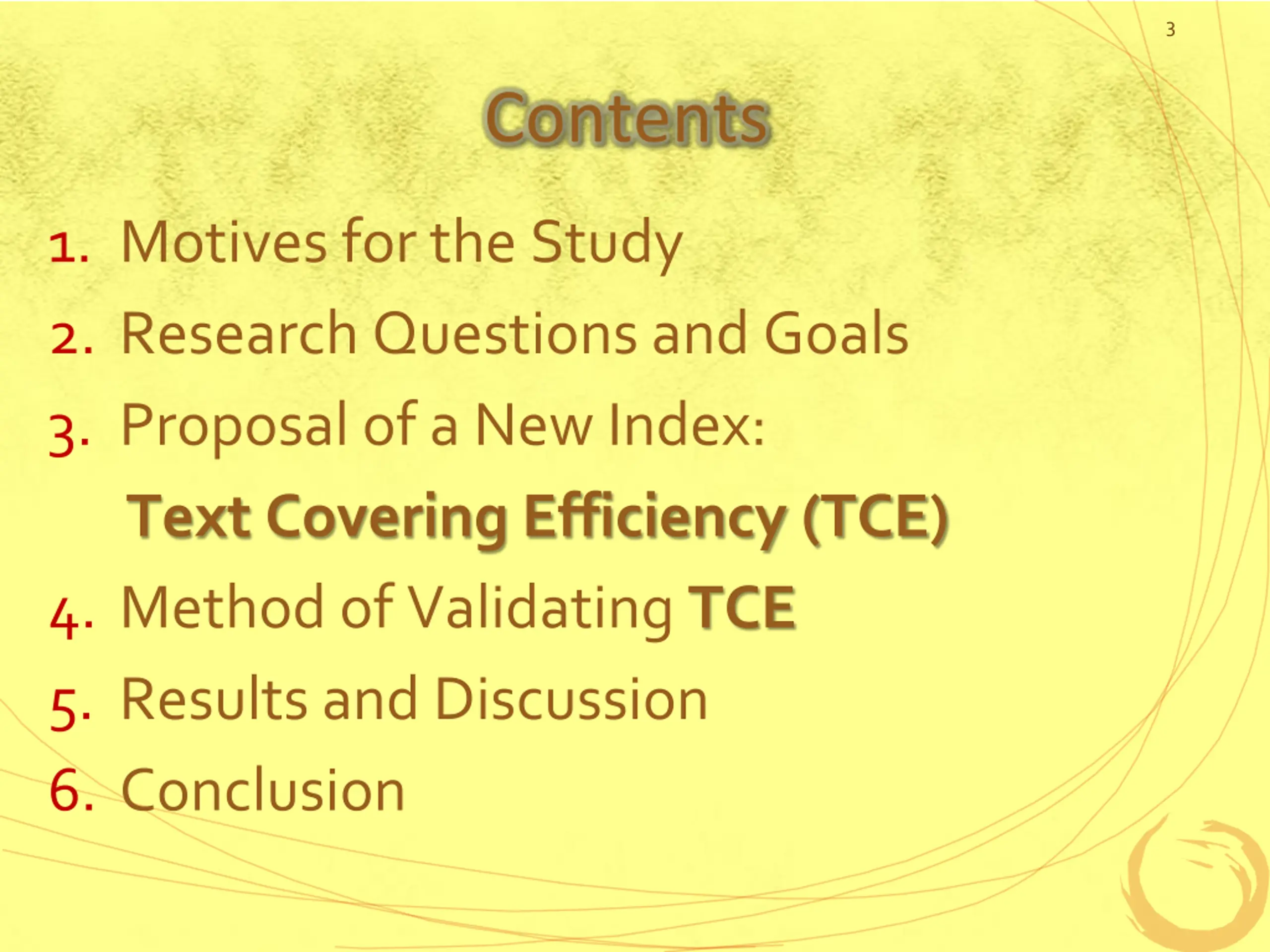 3 Contents 1. Motives for the Study 2. Research Questions and Goals 3. Proposal of a New Index: Text Covering Efficiency (TCE) 4. Method of Validating TCE 5. Results and Discussion 6. Conclusion