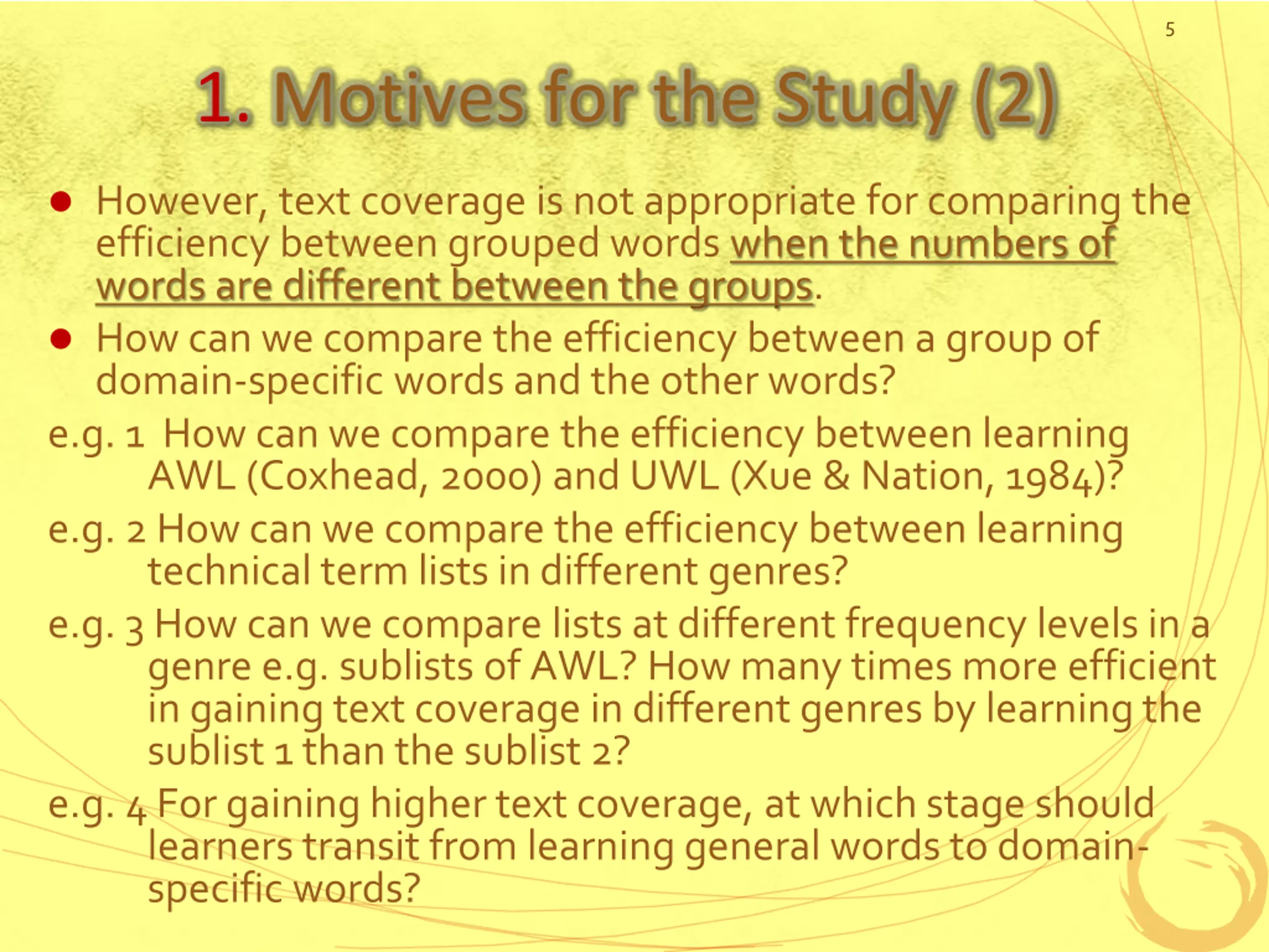 4 1. Motives for the Study (1) How efficiently can we learn vocabulary? What words should learners learn first, second and next? Domain-specific words such as academic words (Coxhead, 2000) are often extracted for efficient vocabulary learning in a genre. Text coverage has been used for evaluating these groups of words (Coxhead, 2000; Hyland & Tse, 2007)