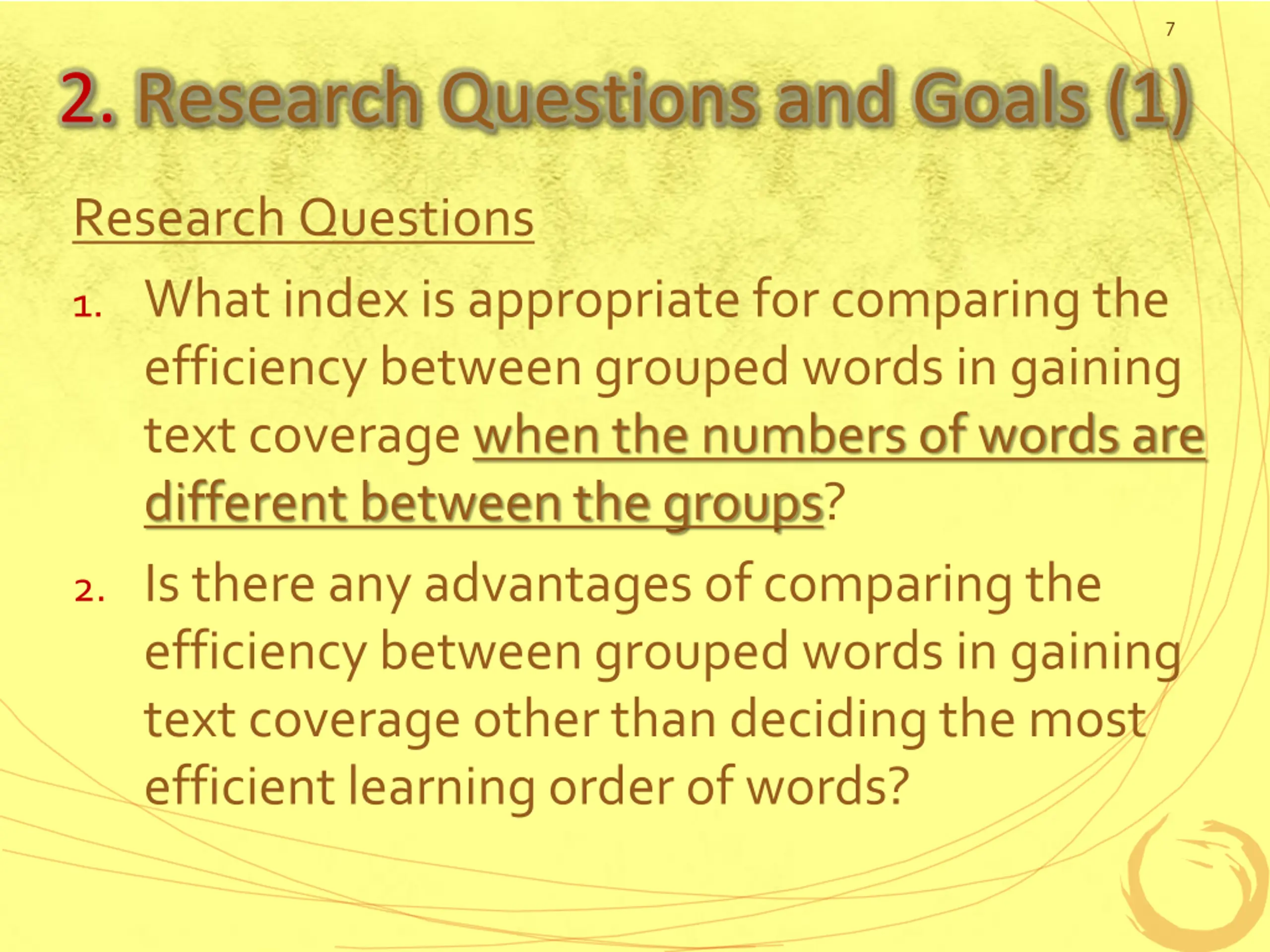 7 2. Research Questions and Goals (1) Research Questions 1. What index is appropriate for comparing the efficiency between grouped words in gaining text coverage when the numbers of words are different between the groups? 2. Is there any advantages of comparing the efficiency between grouped words in gaining text coverage other than deciding the most efficient learning order of words?