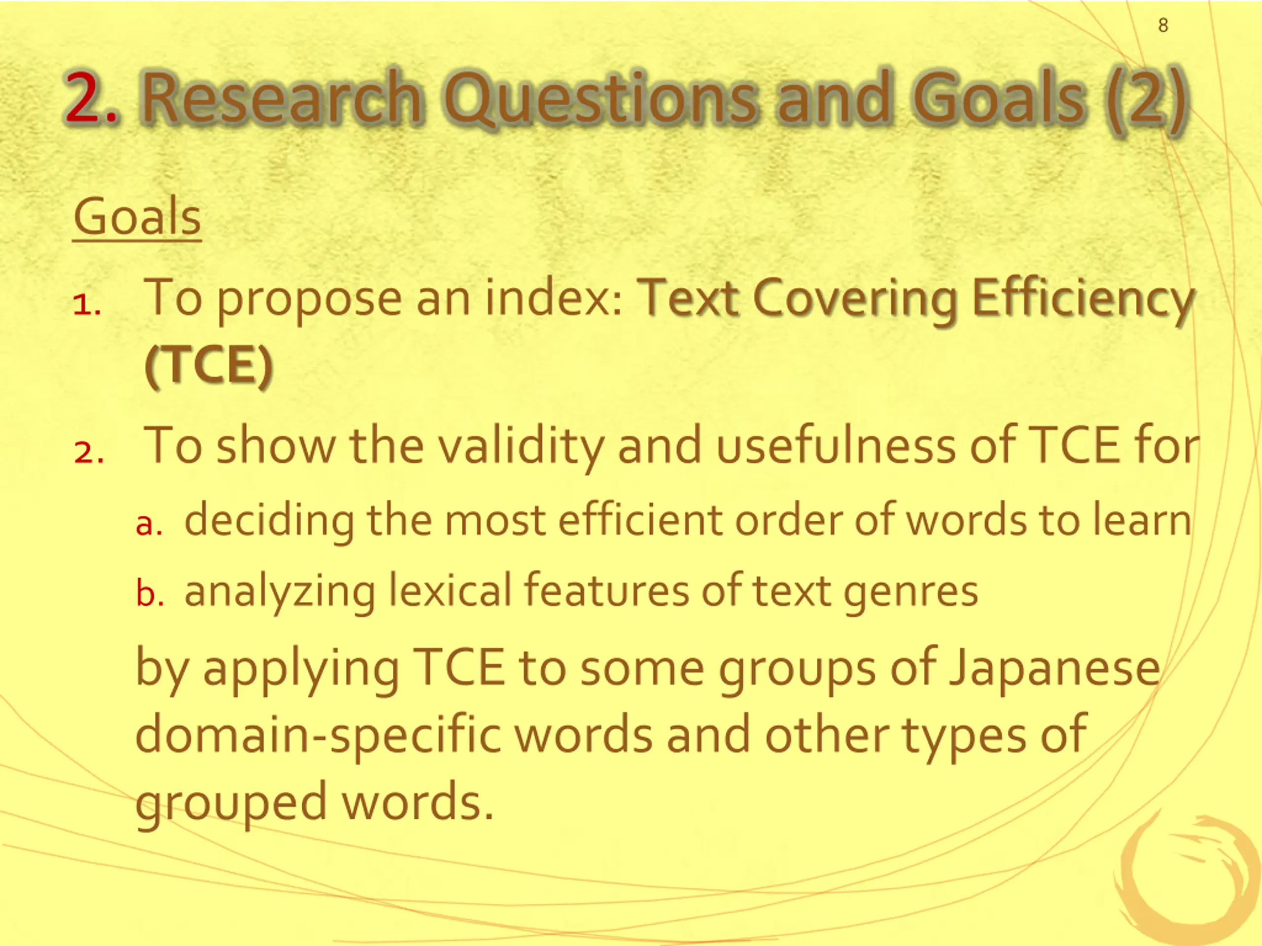 8 2. Research Questions and Goals (2) Goals 1. To propose an index: Text Covering Efficiency (TCE) 2. To show the validity and usefulness of TCE for a. deciding the most efficient order of words to learn b. analyzing lexical features of text genres by applying TCE to some groups of Japanese domain-specific words and other types of grouped words.