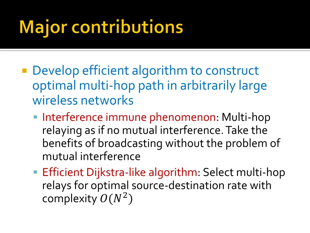 Develop efficient algorithm to construct optimal multi-hop path in arbitrarily large wireless networks Interference immune phenomenon: Multi-hop relaying as if no mutual interference. Take the benefits of broadcasting without the problem of mutual interference Efficient Dijkstra-like algorithm: Select multi-hop relays for optimal source-destination rate with complexity ?(?2)
