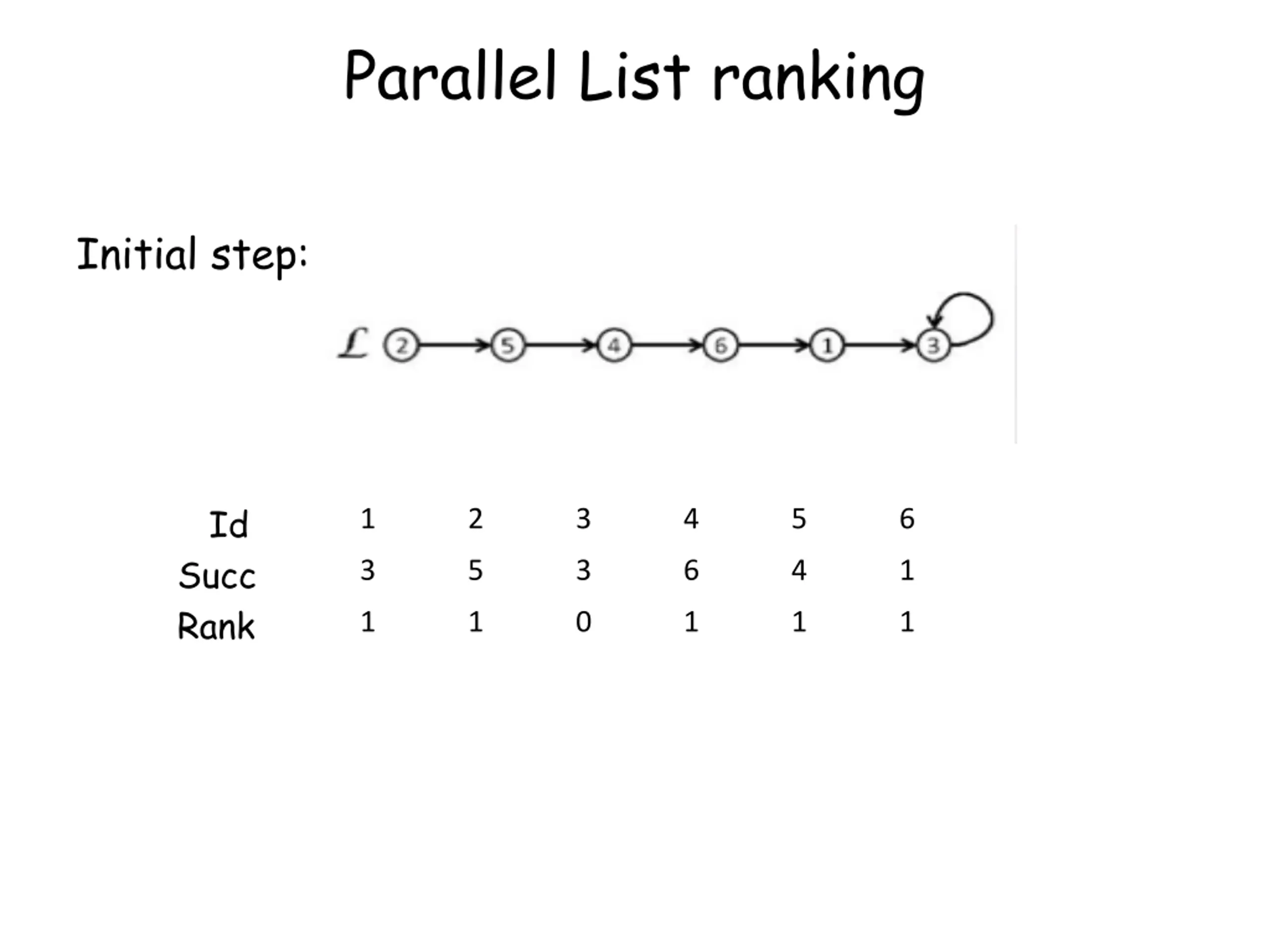 Parallel List ranking Initial step: Id 1 2 3 4 5 6 Succ Rank 3 5 3 6 4 1 1 1 0 1 1 1