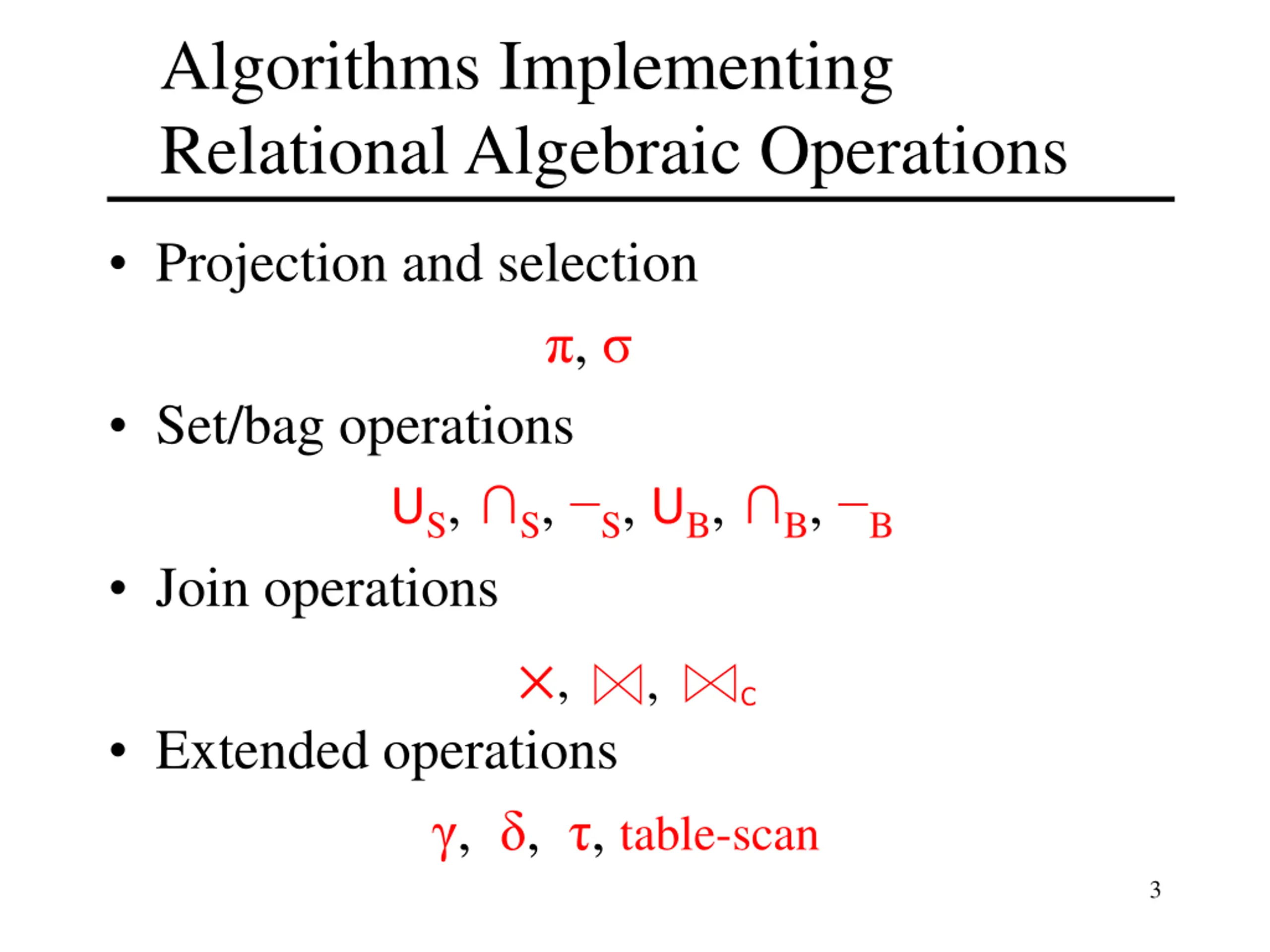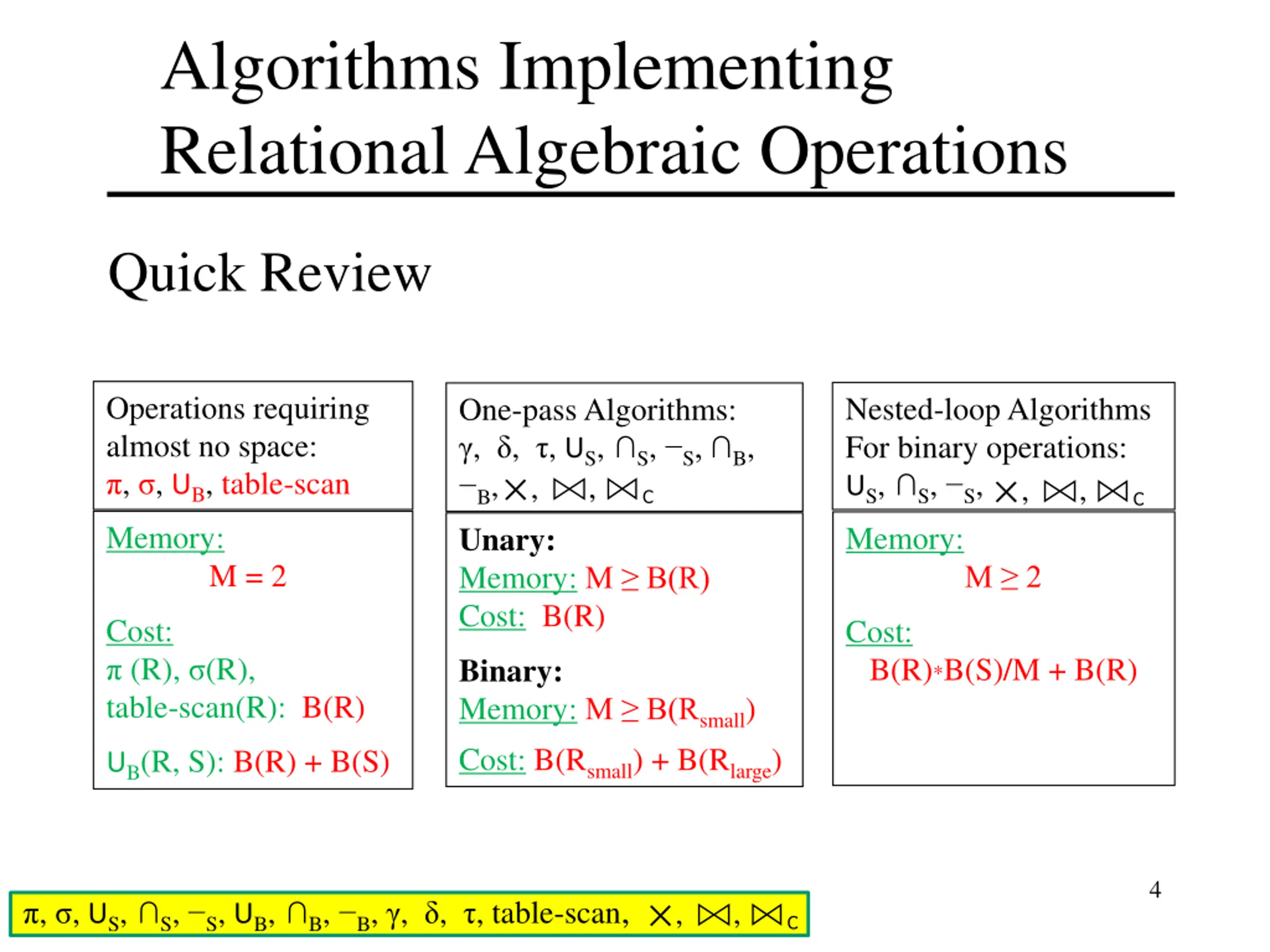 Algorithms Implementing Relational Algebraic Operations Projection and selection , Set/bag operations US, S, S, UB, B, B Join operations , , C Extended operations , , , table-scan 3