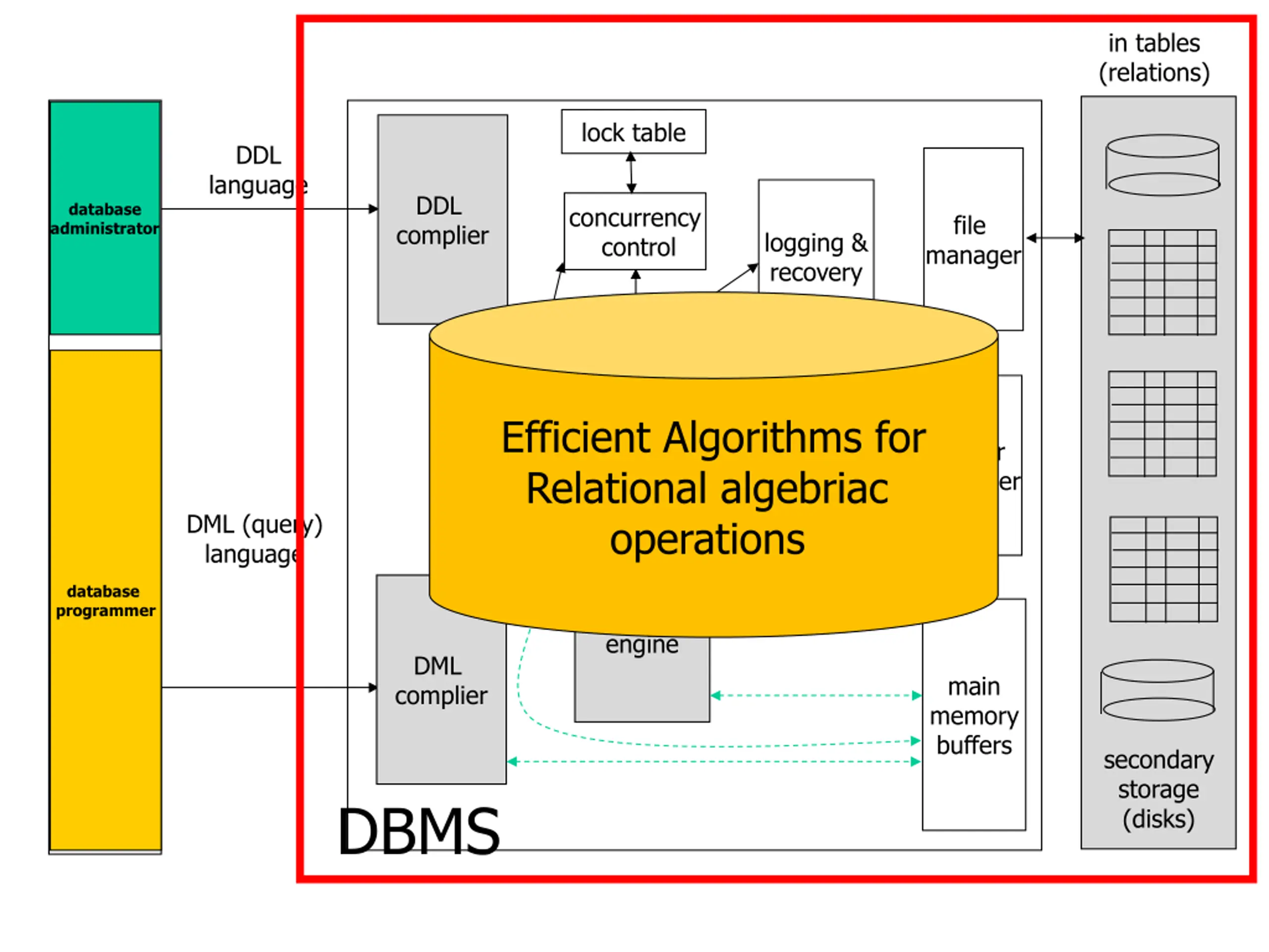 in tables (relations) lock table DDL language DDL complier database administrator concurrency control file logging & recovery manager transaction manager Efficient Algorithms for Relational algebriac operations index/file manager buffer manager DML (query) language query execution engine database programmer DML complier main memory buffers secondary storage (disks) DBMS