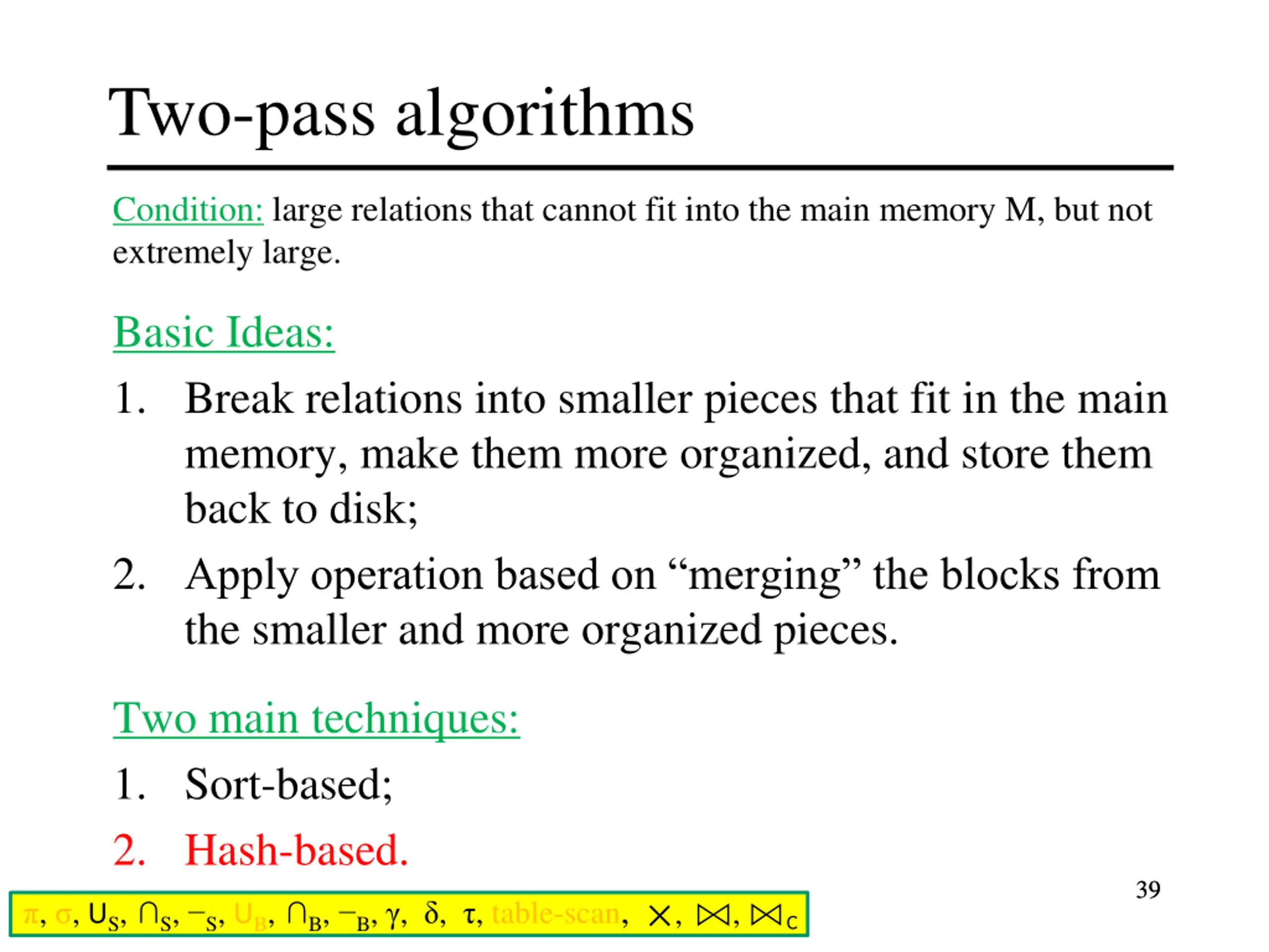 Two-pass algorithms Condition: large relations that cannot fit into the main memory M, but not extremely large. Basic Ideas: 1. Break relations into smaller pieces that fit in the main memory, make them more organized, and store them back to disk; 2. Apply operation based on merging the blocks from the smaller and more organized pieces. Two-pass sort-based algorithms: , , , US, S, S, B, B, Unary: Memory: M B(R) Cost: 3B(R) Two main techniques: 1. Sort-based; 2. Hash-based. Binary: Memory: M B(R) + B(S) Cost: 3(B(R) + B(S)) 38 38 , , US, S, S, UB, B, B, , , , table-scan, , , C
