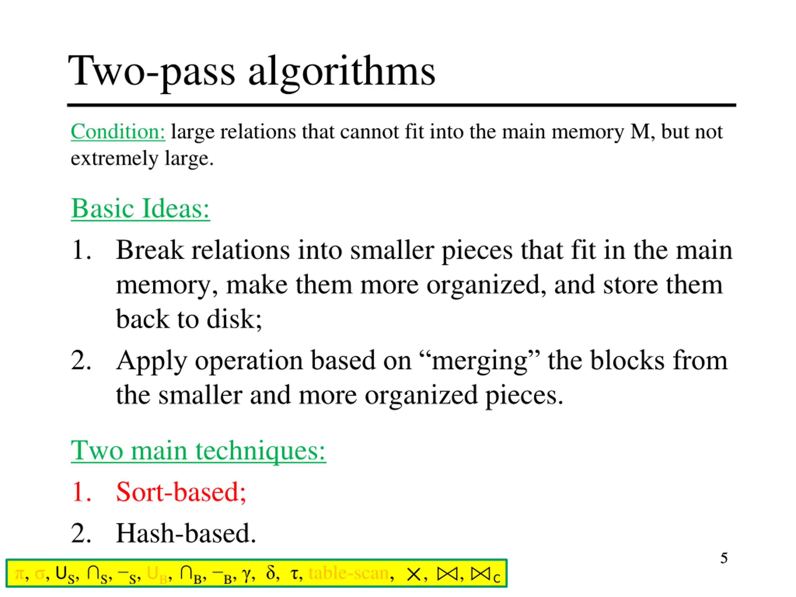 Two-pass algorithms Condition: large relations that cannot fit into the main memory M, but not extremely large. Basic Ideas: 1. Break relations into smaller pieces that fit in the main memory, make them more organized, and store them back to disk; 2. Apply operation based on merging the blocks from the smaller and more organized pieces. Two main techniques: 1. Sort-based; 2. Hash-based. 5 5 , , US, S, S, UB, B, B, , , , table-scan, , , C