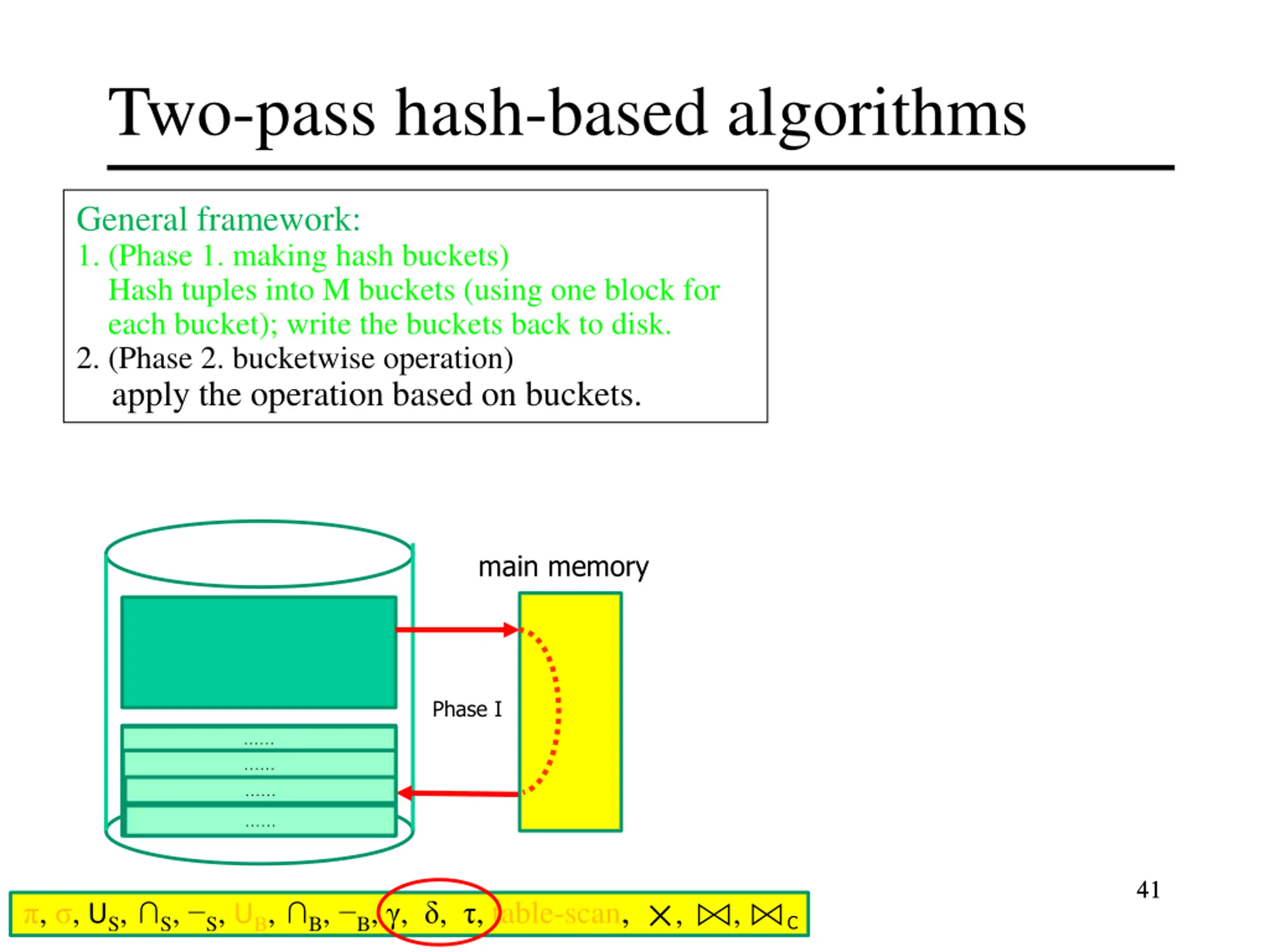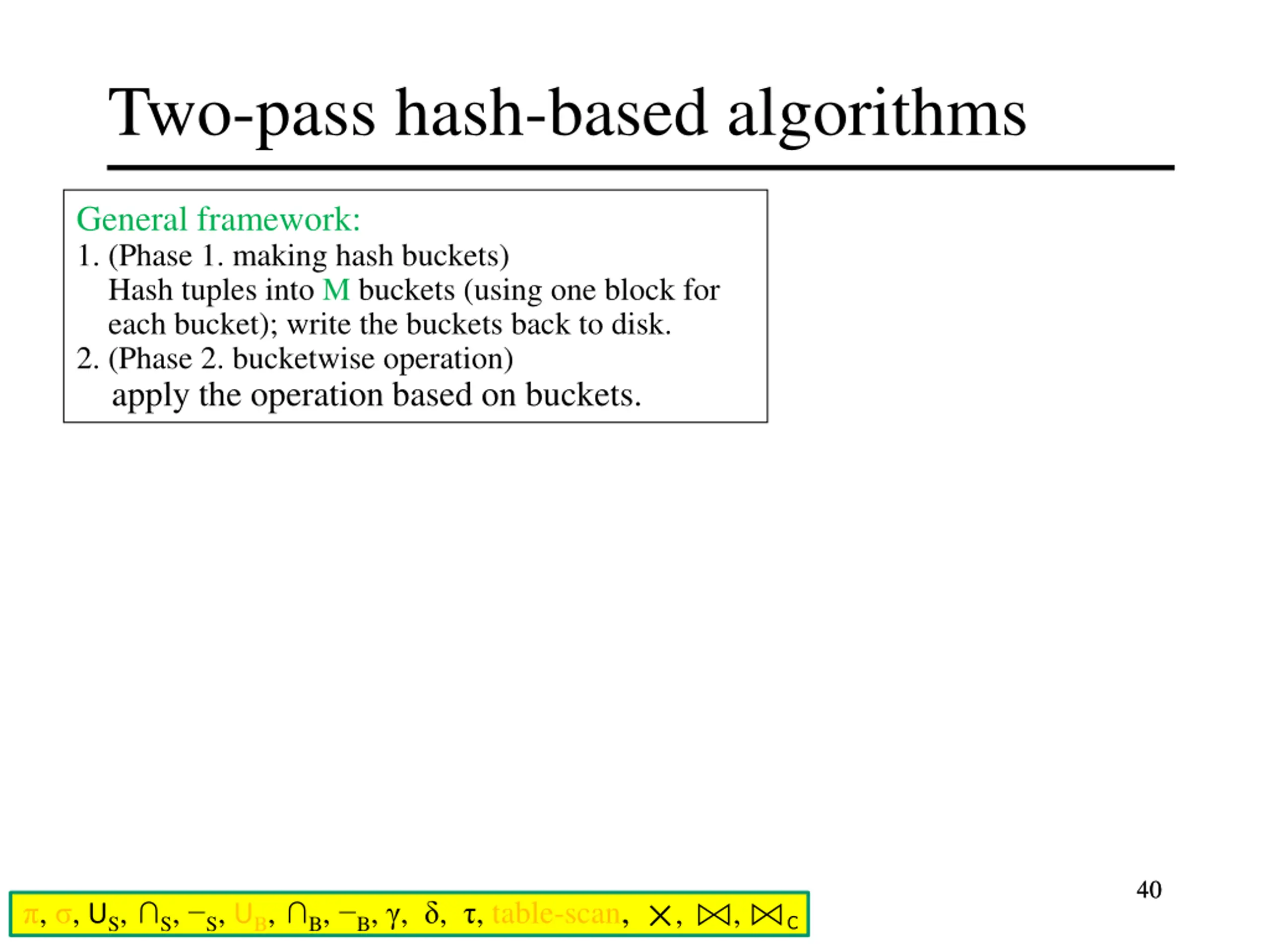Two-pass hash-based algorithms General framework: 1. (Phase 1. making hash buckets) Hash tuples into M buckets (using one block for each bucket); write the buckets back to disk. 2. (Phase 2. bucketwise operation) apply the operation based on buckets. R 40 40 , , US, S, S, UB, B, B, , , , table-scan, , , C