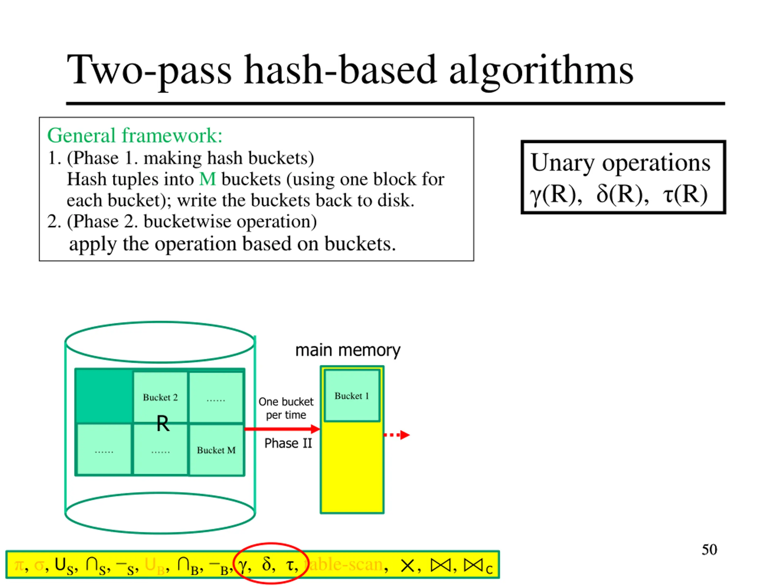 Two-pass hash-based algorithms General framework: 1. (Phase 1. making hash buckets) Hash tuples into M buckets (using one block for each bucket); write the buckets back to disk. 2. (Phase 2. bucketwise operation) apply the operation based on buckets. Unary operations (R), (R), (R) main memory Bucket 1 Bucket 2 R End of phase I Bucket M 49 49 , , US, S, S, UB, B, B, , , , table-scan, , , C