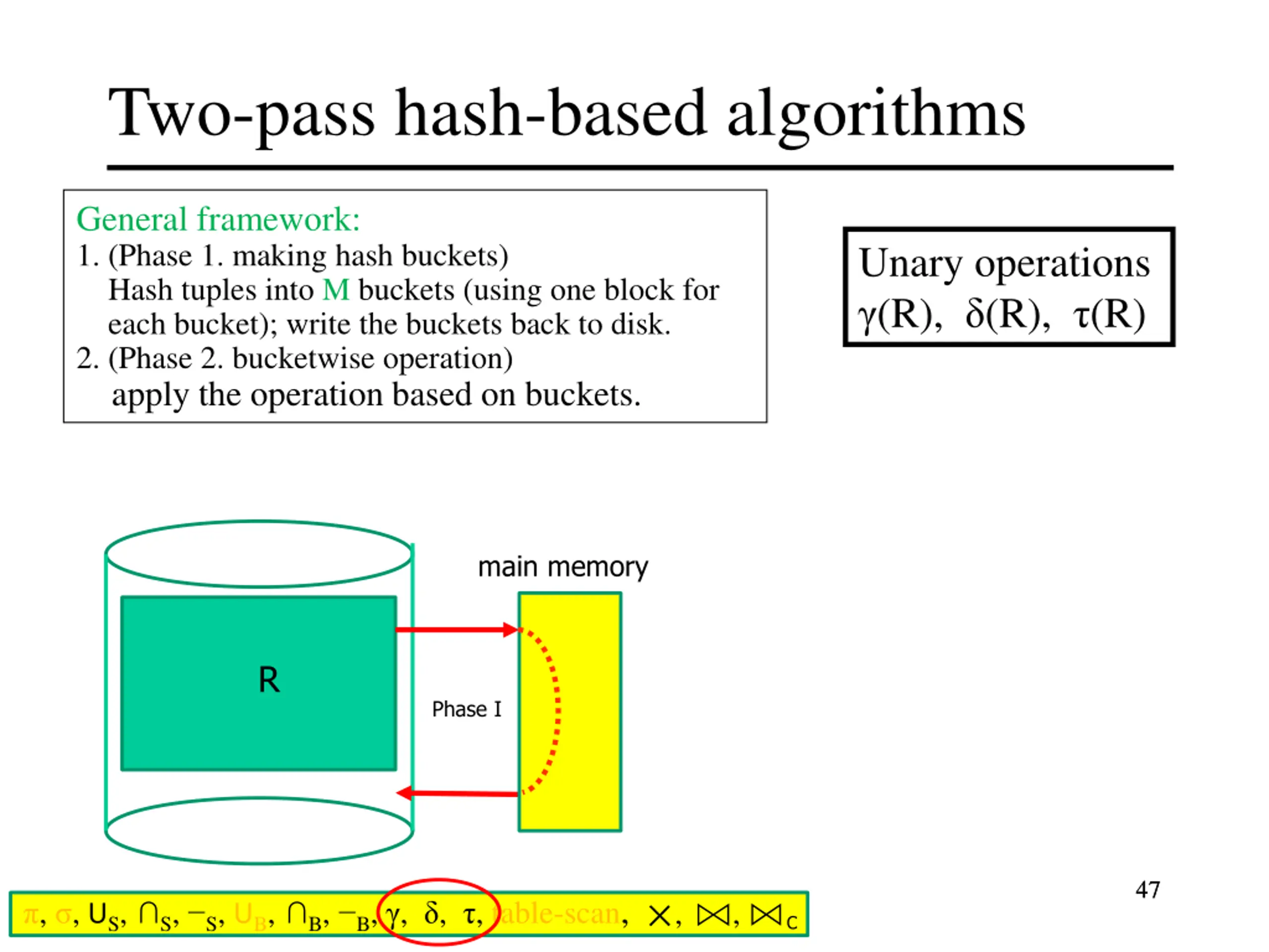Two-pass hash-based algorithms General framework: 1. (Phase 1. making hash buckets) Hash tuples into M buckets (using one block for each bucket); write the buckets back to disk. 2. (Phase 2. bucketwise operation) apply the operation based on buckets. Unary operations (R), (R), (R) main memory R 46 46 , , US, S, S, UB, B, B, , , , table-scan, , , C