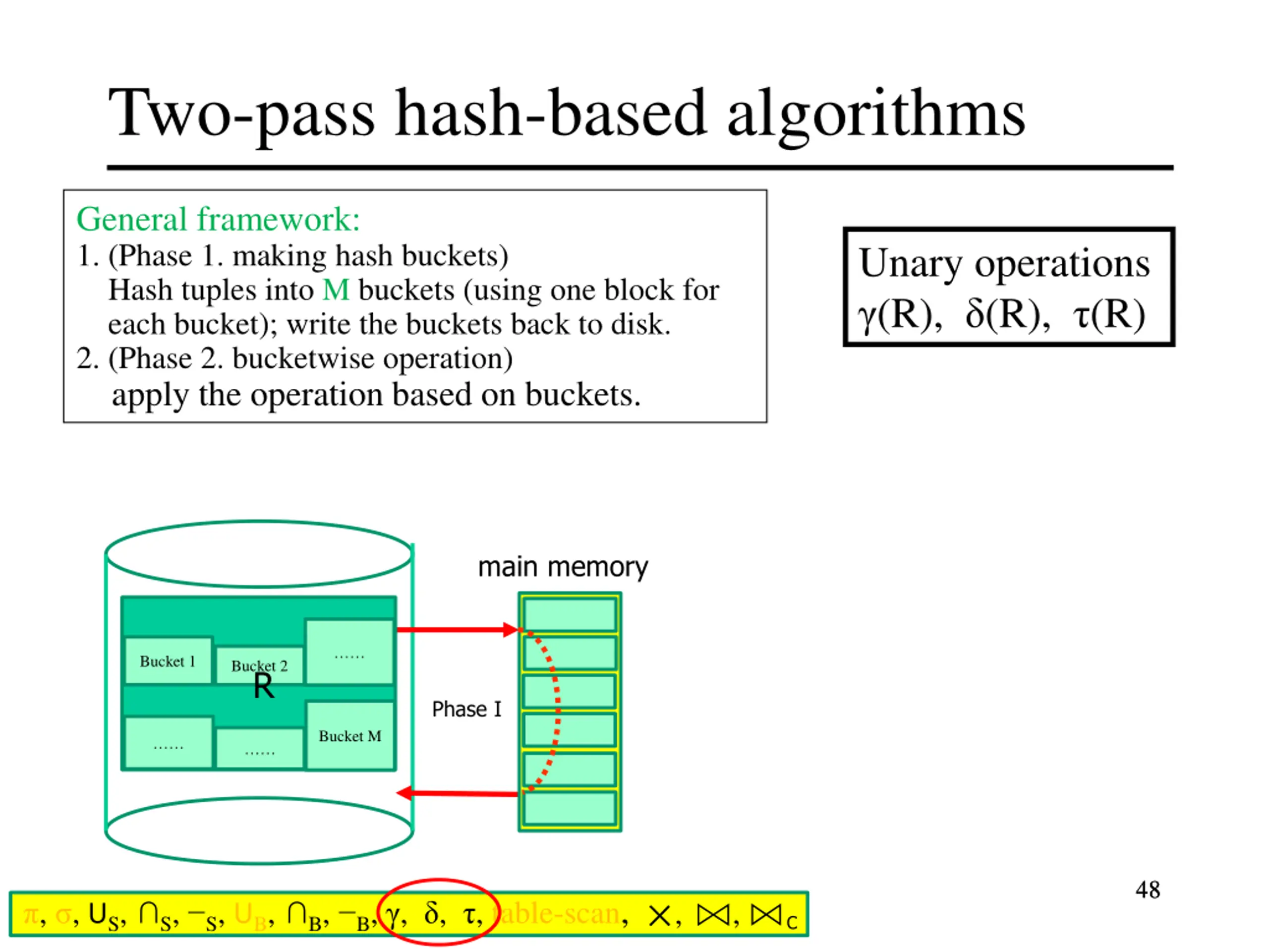 Two-pass hash-based algorithms General framework: 1. (Phase 1. making hash buckets) Hash tuples into M buckets (using one block for each bucket); write the buckets back to disk. 2. (Phase 2. bucketwise operation) apply the operation based on buckets. Unary operations (R), (R), (R) main memory R Phase I 47 47 , , US, S, S, UB, B, B, , , , table-scan, , , C