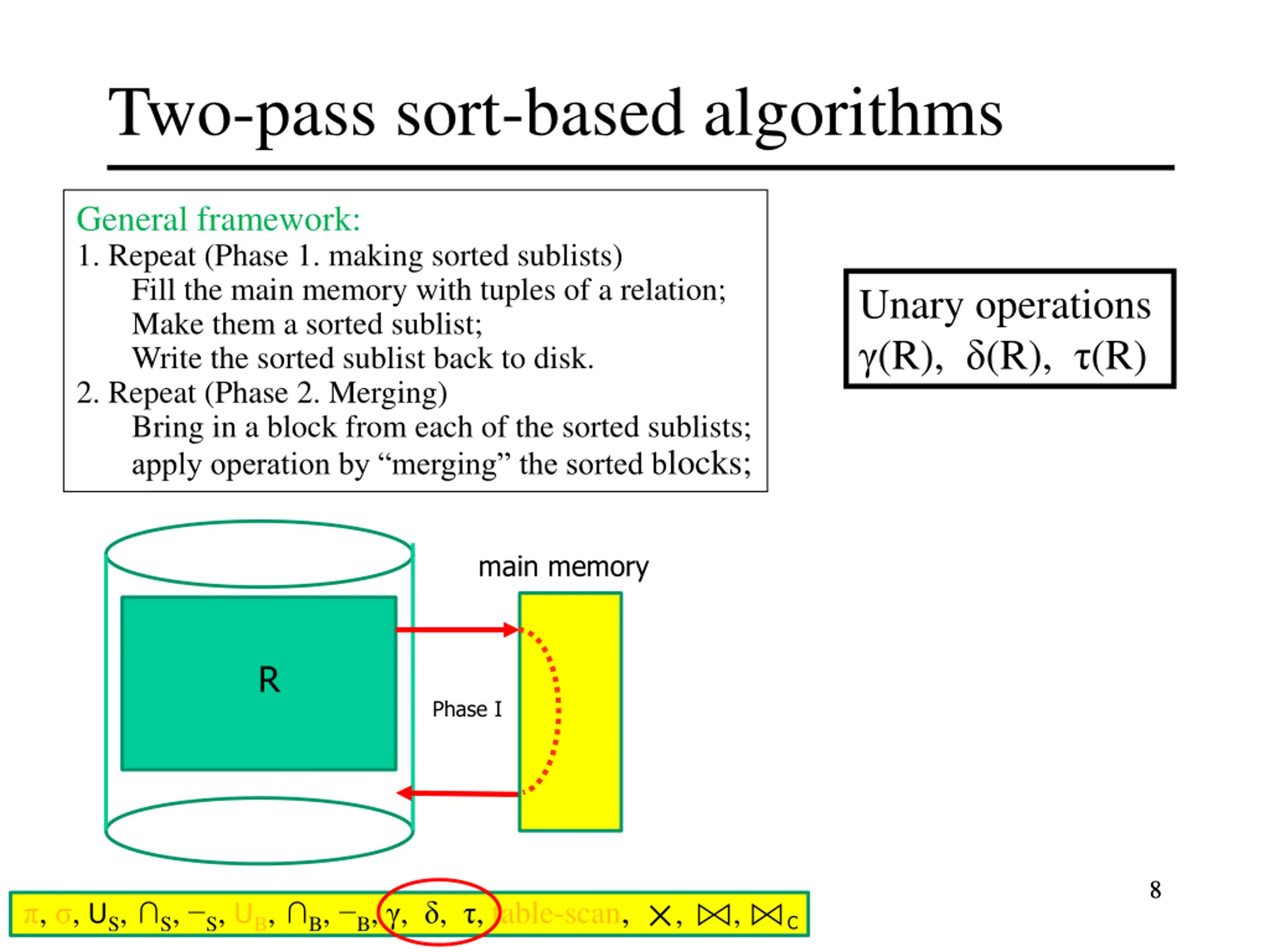 Two-pass sort-based algorithms General framework: 1. Repeat (Phase 1. making sorted sublists) Fill the main memory with tuples of a relation; Make them a sorted sublist; Write the sorted sublist back to disk. 2. Repeat (Phase 2. Merging) Bring in a block from each of the sorted sublists; apply operation by merging the sorted blocks; Unary operations (R), (R), (R) main memory R 7 7 , , US, S, S, UB, B, B, , , , table-scan, , , C