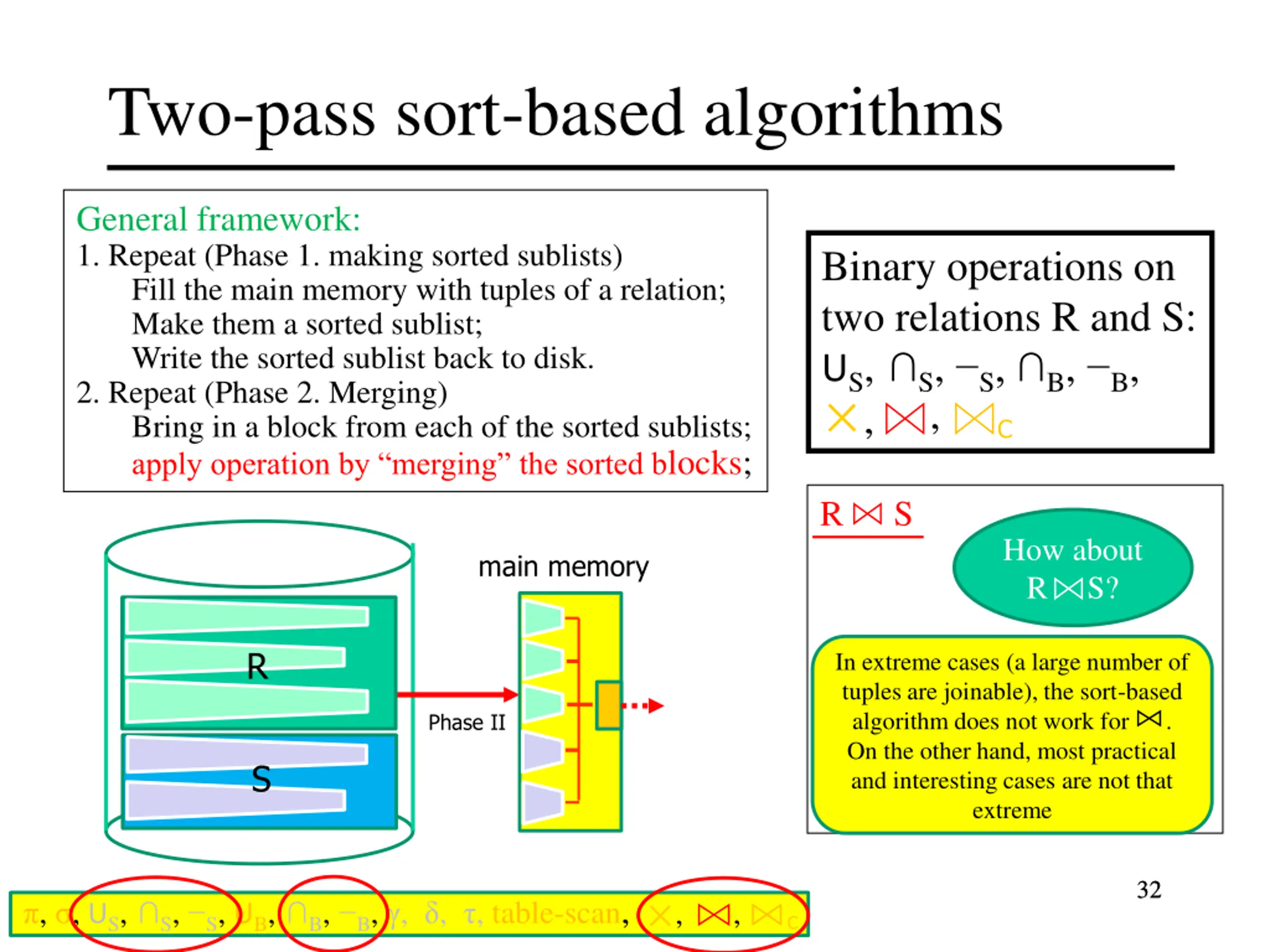 Two-pass sort-based algorithms General framework: 1. Repeat (Phase 1. making sorted sublists) Fill the main memory with tuples of a relation; Make them a sorted sublist; Write the sorted sublist back to disk. 2. Repeat (Phase 2. Merging) Bring in a block from each of the sorted sublists; apply operation by merging the sorted blocks; Binary operations on two relations R and S: US, S, S, B, B, , C , R S How about R S? main memory R Phase II S 31 31 , , US, S, S, UB, B, B, , , , table-scan, , , C