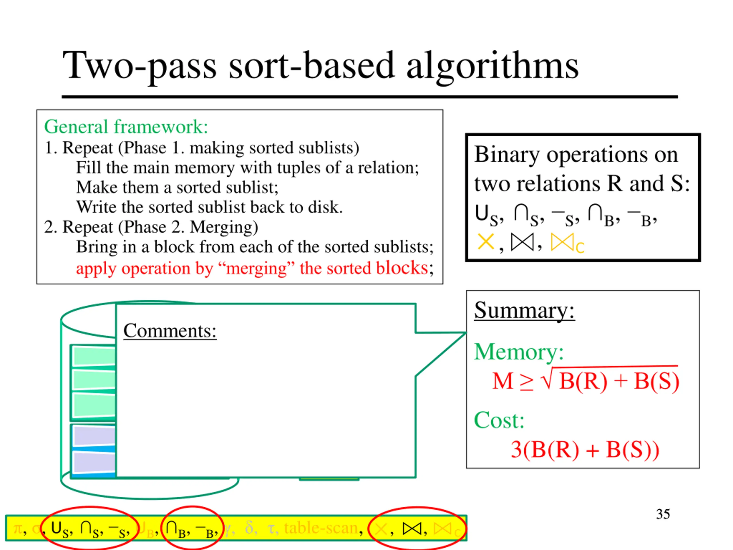 Two-pass sort-based algorithms General framework: 1. Repeat (Phase 1. making sorted sublists) Fill the main memory with tuples of a relation; Make them a sorted sublist; Write the sorted sublist back to disk. 2. Repeat (Phase 2. Merging) Bring in a block from each of the sorted sublists; apply operation by merging the sorted blocks; Binary operations on two relations R and S: US, S, S, B, B, , C , Summary: main memory Memory: M B(R) + B(S) Cost: 3(B(R) + B(S)) R Phase II S 34 34 , , US, S, S, UB, B, B, , , , table-scan, , , C