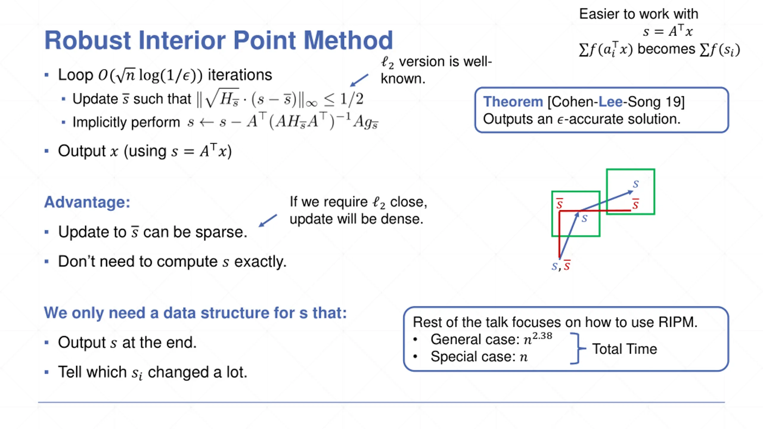 Easier to work with ? = ? ? Robust Interior Point Method ?) becomes ?(??) ?(?? 2 version is well- known. Loop ?( ? log(1/?)) iterations Update ? such that Implicitly perform Theorem [Cohen-Lee-Song 19] Outputs an ?-accurate solution. Output ? (using ? = ? ?) ? ? Advantage: If we require 2 close, update will be dense. ? ? Update to ? can be sparse. Don t need to compute ? exactly. ?,? We only need a data structure for s that: Rest of the talk focuses on how to use RIPM. General case: ?2.38 Special case: ? Output ? at the end. Total Time Tell which ?? changed a lot.
