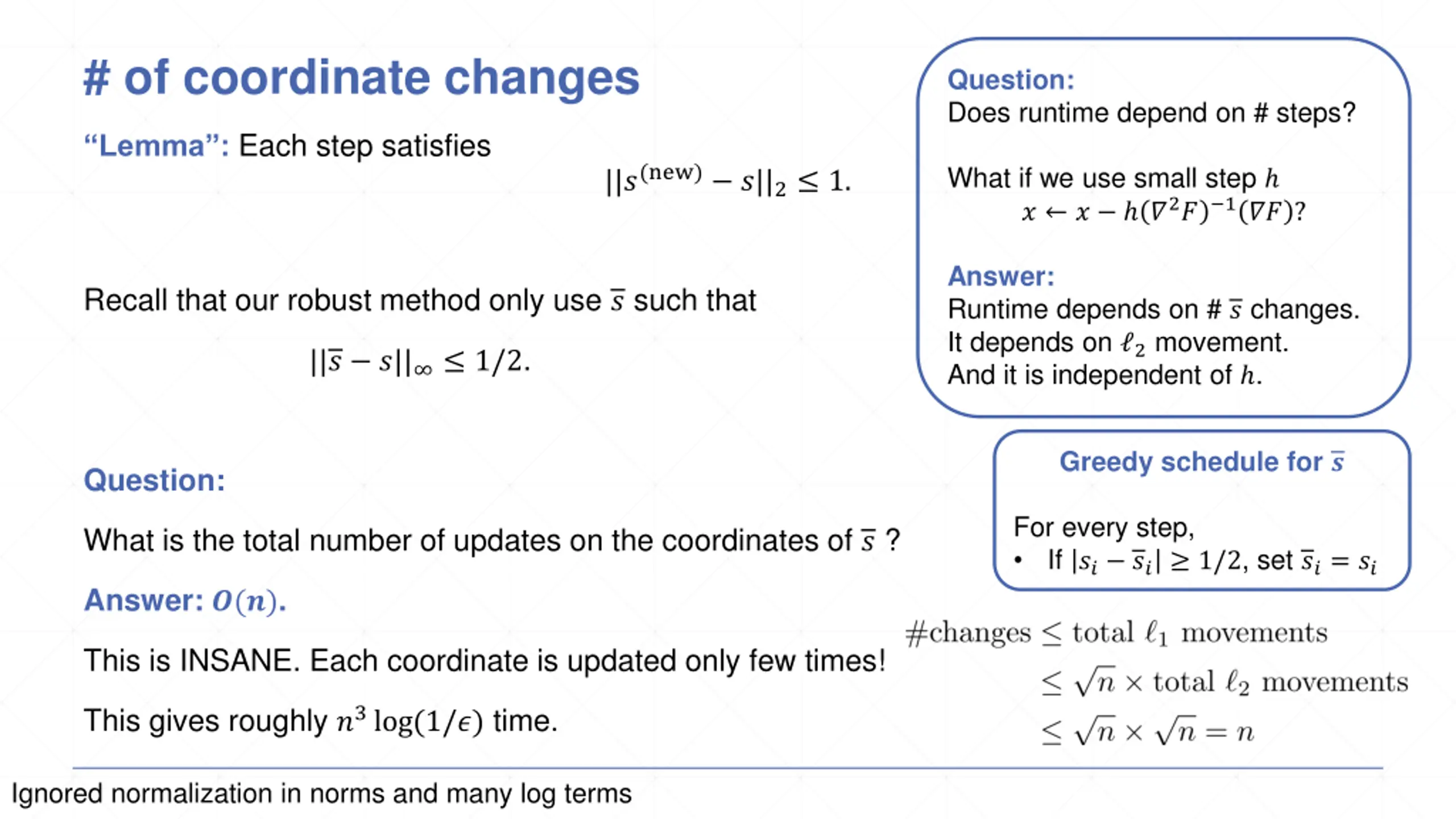 # of coordinate changes Question: Does runtime depend on # steps? Lemma : Each step satisfies What if we use small step ? ? ?2? 1?? ? ||?(new) ?||2 1. Answer: Runtime depends on # ? changes. It depends on 2 movement. And it is independent of . Recall that our robust method only use ? such that ||? ?|| 1/2. Greedy schedule for ? Question: For every step, If ?? ?? 1/2, set ??= ?? What is the total number of updates on the coordinates of ? ? Answer: ?(?). This is INSANE. Each coordinate is updated only few times! This gives roughly ?3log(1/?) time. Ignored normalization in norms and many log terms
