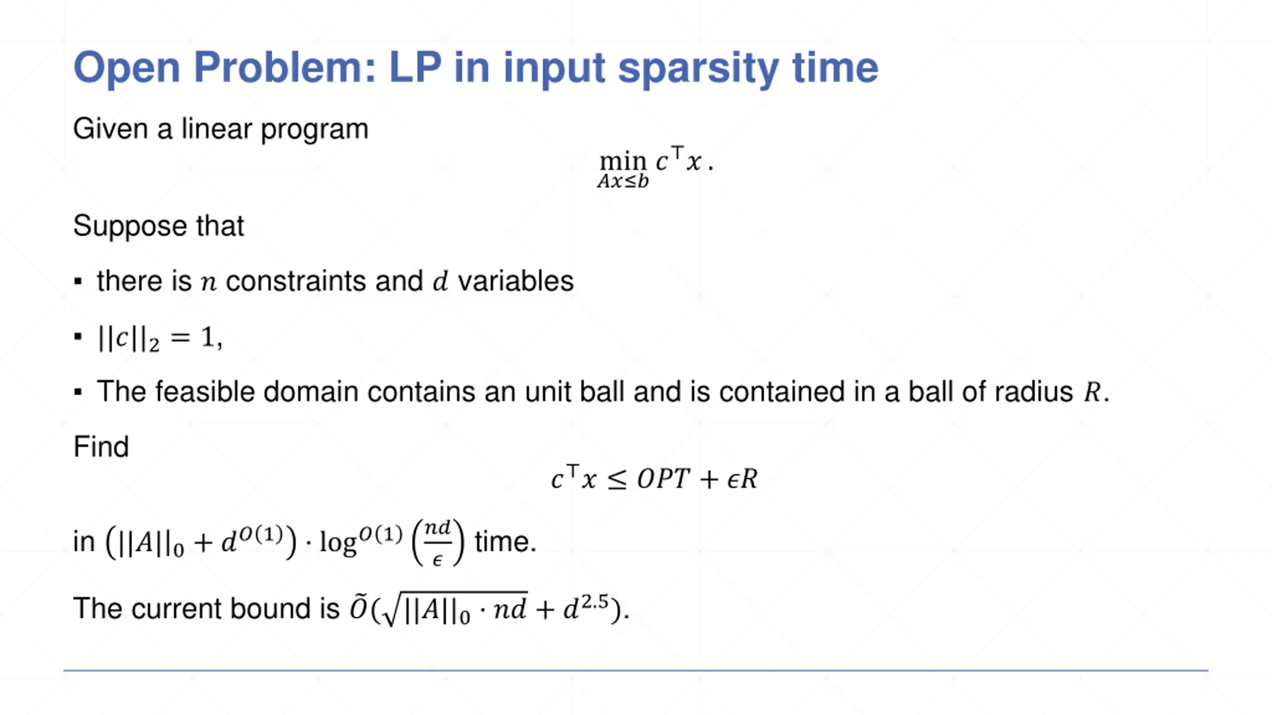 Open Problem: LP in input sparsity time Given a linear program ?? ?? ?. min Suppose that there is ? constraints and ? variables ||?||2= 1, The feasible domain contains an unit ball and is contained in a ball of radius ?. Find ? ? ??? + ?? ?? ? in ||?||0+ ?? 1 time. log? 1 The current bound is ?( ||?||0 ?? + ?2.5).