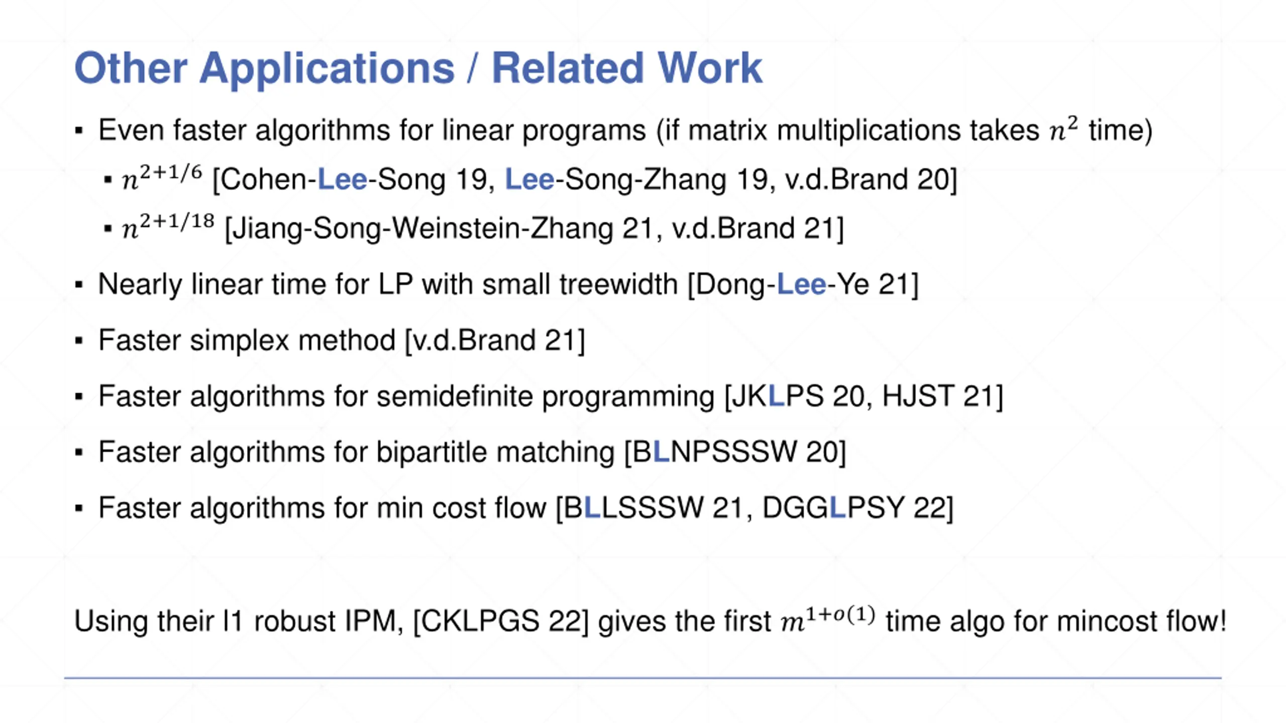 Other Applications / Related Work Even faster algorithms for linear programs (if matrix multiplications takes ?2 time) ?2+1/6 [Cohen-Lee-Song 19, Lee-Song-Zhang 19, v.d.Brand 20] ?2+1/18 [Jiang-Song-Weinstein-Zhang 21, v.d.Brand 21] Nearly linear time for LP with small treewidth [Dong-Lee-Ye 21] Faster simplex method [v.d.Brand 21] Faster algorithms for semidefinite programming [JKLPS 20, HJST 21] Faster algorithms for bipartitle matching [BLNPSSSW 20] Faster algorithms for min cost flow [BLLSSSW 21, DGGLPSY 22] Using their l1 robust IPM, [CKLPGS 22] gives the first ?1+?(1)time algo for mincost flow!