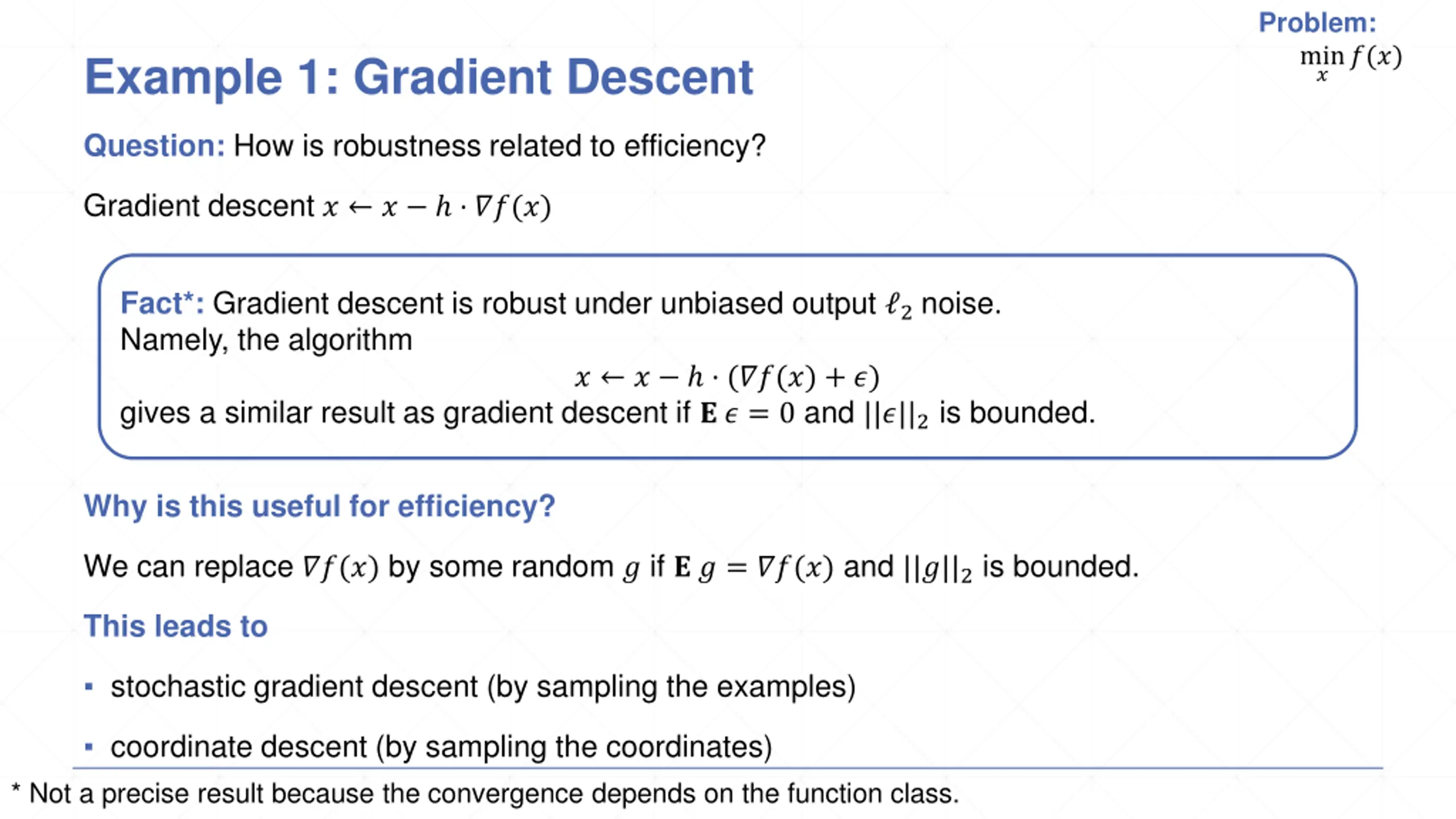 Problem: min ? ?(?) Example 1: Gradient Descent Question: How is robustness related to efficiency? Gradient descent ? ? ??(?) Fact*: Gradient descent is robust under unbiased output 2noise. Namely, the algorithm ? ? (??(?) + ?) gives a similar result as gradient descent if ? ? = 0 and ||?||2 is bounded. Why is this useful for efficiency? We can replace ??(?) by some random ? if ? ? = ??(?) and ||?||2 is bounded. This leads to stochastic gradient descent (by sampling the examples) coordinate descent (by sampling the coordinates) * Not a precise result because the convergence depends on the function class.