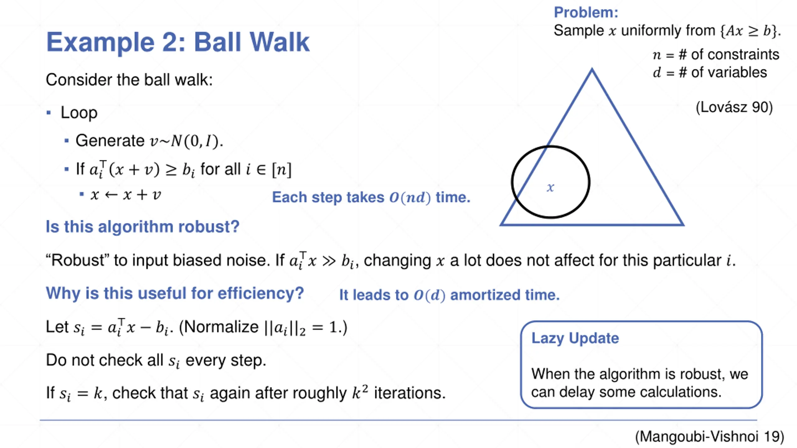 Problem: Sample ? uniformly from {?? ?}. Example 2: Ball Walk ? = # of constraints ? = # of variables Consider the ball walk: (Lov sz 90) Loop Generate ?~?(0,?). ? + ? ?? for all ? [?] If ?? ? ? + ? ? Each step takes ?(??) time. Is this algorithm robust? ? ??, changing ? a lot does not affect for this particular ?. Robust to input biased noise. If ?? Why is this useful for efficiency? It leads to ?(?) amortized time. ? ??. (Normalize ||??||2= 1.) Let ??= ?? Lazy Update Do not check all ?? every step. When the algorithm is robust, we can delay some calculations. If ??= ?, check that ?? again after roughly ?2 iterations. (Mangoubi-Vishnoi 19)