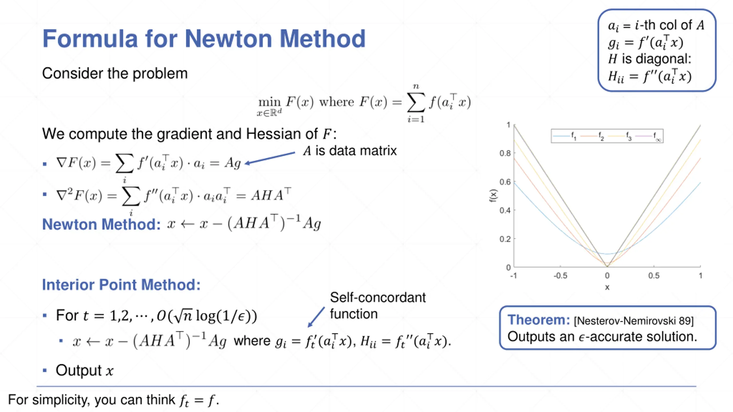 ??= ?-th col of ? ??= ? (?? ? is diagonal: ???= ? (?? Formula for Newton Method ?) Consider the problem ?) We compute the gradient and Hessian of ?: ? is data matrix Newton Method: Interior Point Method: Self-concordant function For ? = 1,2, ,?( ? log(1/?)) Theorem:[Nesterov-Nemirovski 89] Outputs an ?-accurate solution. ?), ???= ?? (?? ?). where ??= ?? (?? Output ? For simplicity, you can think ??= ?.