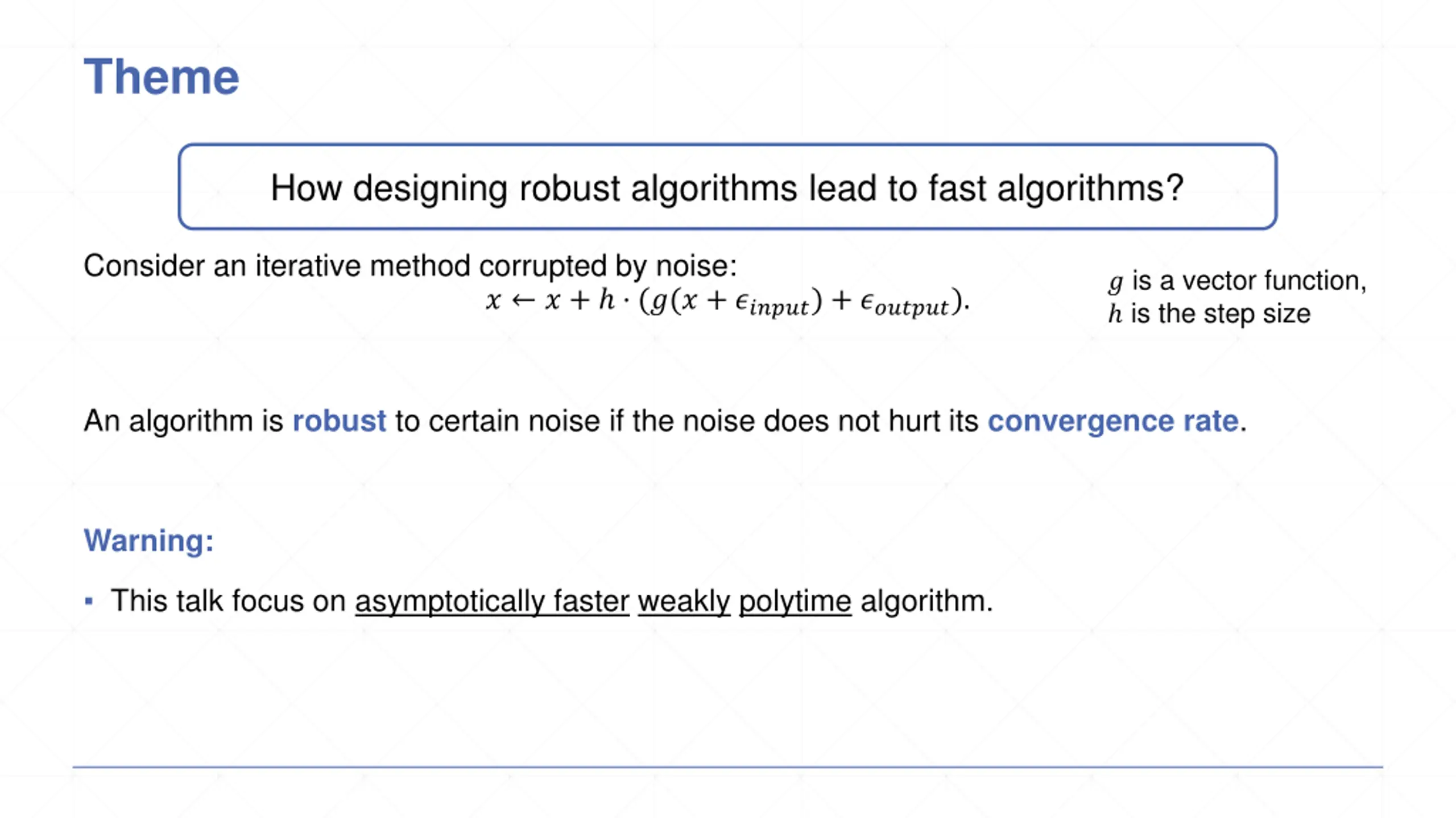 Theme How designing robust algorithms lead to fast algorithms? Consider an iterative method corrupted by noise: ? is a vector function, is the step size ? ? + (?(? + ??????) + ???????). An algorithm is robust to certain noise if the noise does not hurt its convergence rate. Warning: This talk focus on asymptotically faster weakly polytime algorithm.