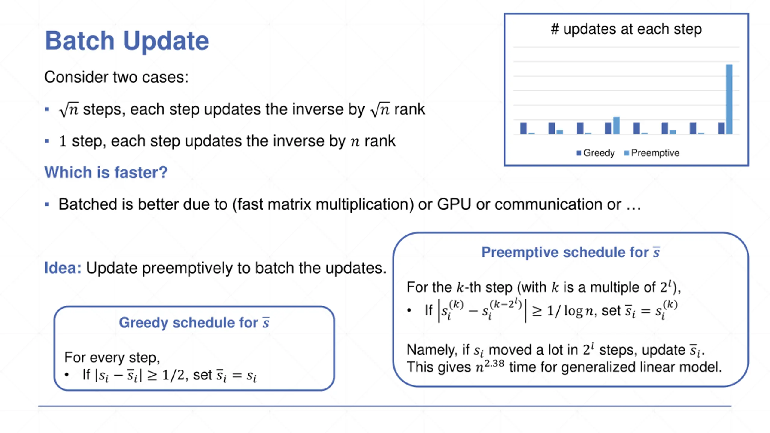 # updates at each step Batch Update Consider two cases: ? steps, each step updates the inverse by ? rank 1 step, each step updates the inverse by ? rank Greedy Preemptive Which is faster? Batched is better due to (fast matrix multiplication) or GPU or communication or Preemptive schedule for ? Idea: Update preemptively to batch the updates. For the ?-th step (with ? is a multiple of 2?), If ?? (? 2?) 1/log?, set ??= ?? (?) ?? (?) Greedy schedule for ? Namely, if ?? moved a lot in 2? steps, update ??. This gives ?2.38 time for generalized linear model. For every step, If ?? ?? 1/2, set ??= ??