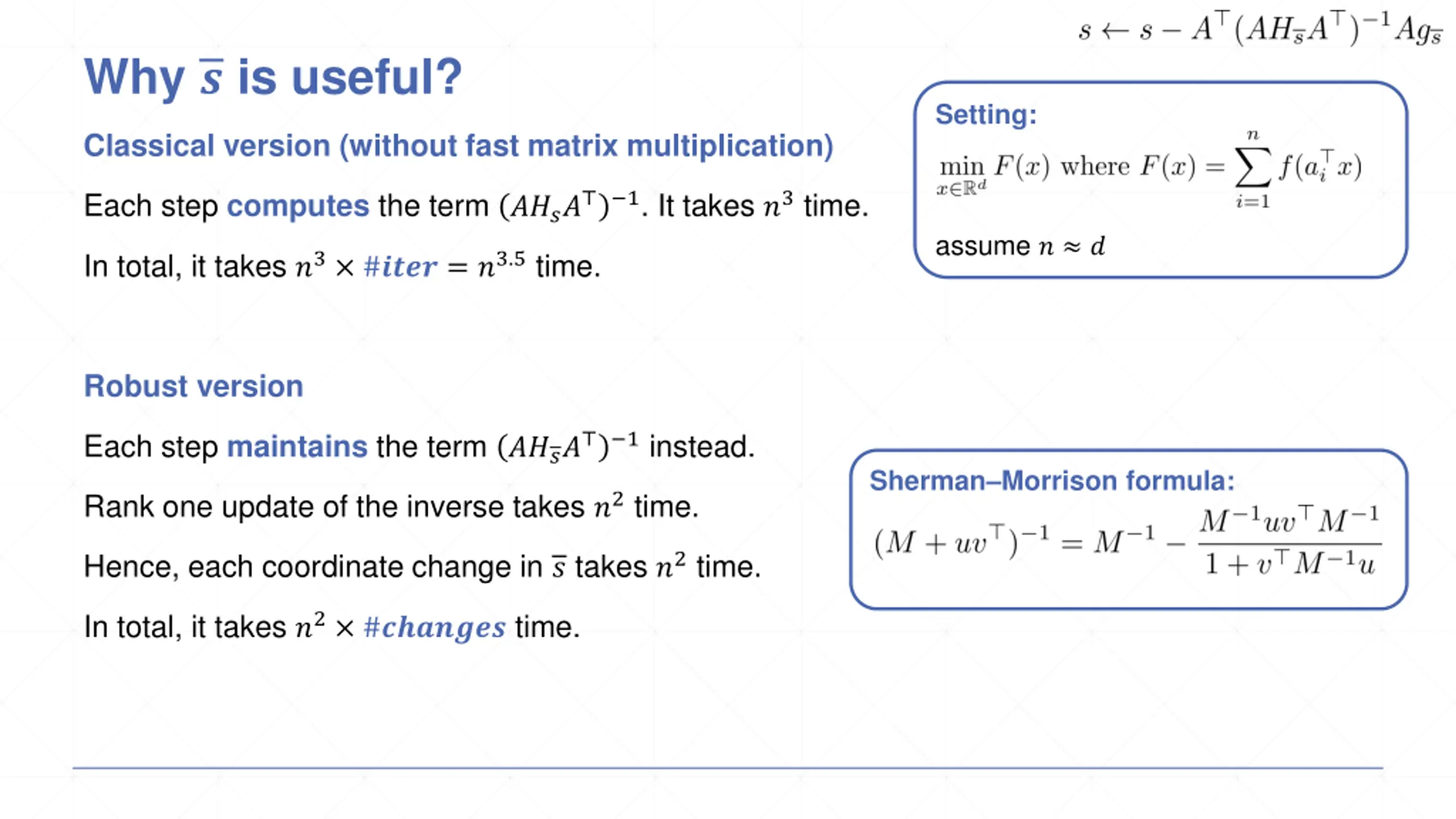 Why ? is useful? Setting: Classical version (without fast matrix multiplication) Each step computes the term ???? 1. It takes ?3 time. assume ? ? In total, it takes ?3 #???? = ?3.5 time. Robust version Each step maintains the term ???? 1 instead. Sherman Morrison formula: Rank one update of the inverse takes ?2 time. Hence, each coordinate change in ? takes ?2 time. In total, it takes ?2 #??????? time.