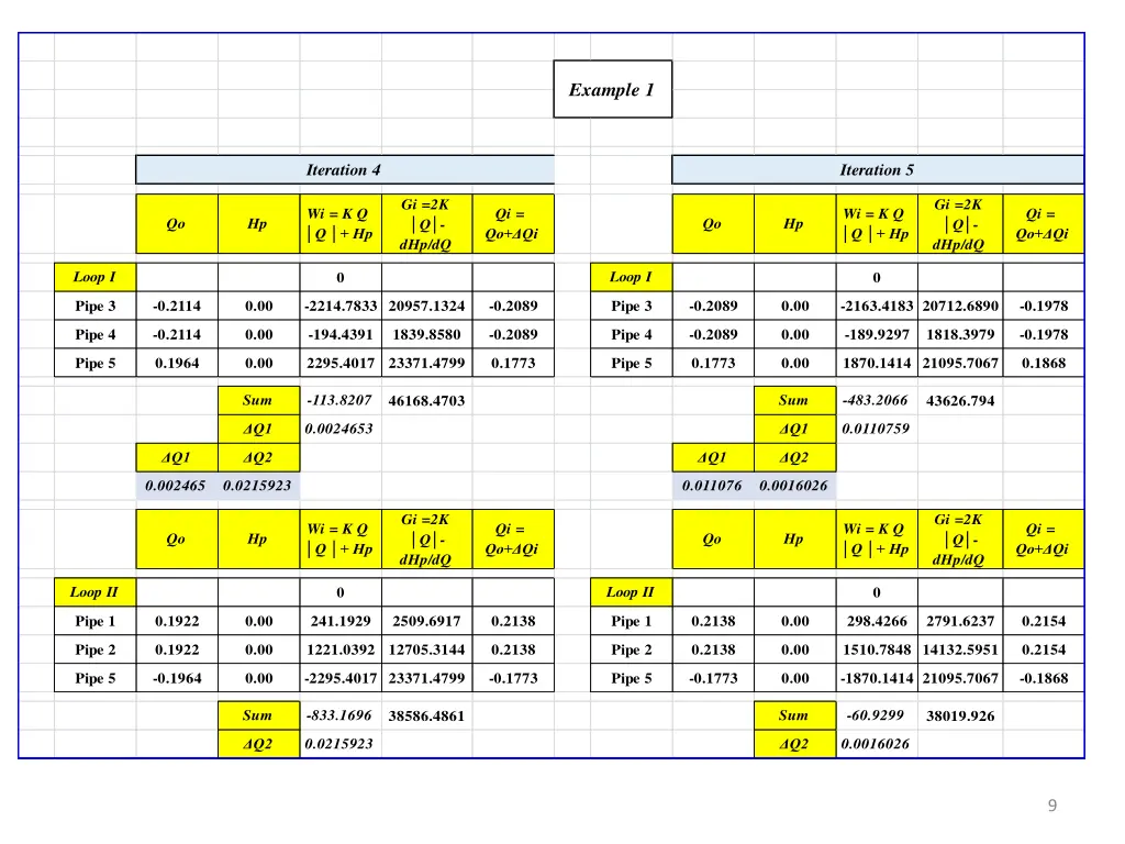 Example 1 Iteration 2 Iteration 3 Gi =2K Q - dHp/dQ Wi = K Q Q + Hp Gi =2K Q - dHp/dQ Qi = Qo+ Qi Wi = K Q Q + Hp Qi = Qo+ Qi Qo Hp Qo Hp Loop I Loop I 0 0 Pipe 3 -0.2540 0.00 -3199.5281 25188.9000 -0.2510 Pipe 3 -0.2510 0.00 -3122.9859 24885.7794 -0.2114 Pipe 4 -0.2540 0.00 -280.8914 2211.3712 -0.2510 Pipe 4 -0.2510 0.00 -274.1716 2184.7598 -0.2114 Pipe 5 0.2359 0.00 3310.8432 28068.9501 0.1620 Pipe 5 0.1620 0.00 1560.9200 19272.9054 0.1964 Sum -169.5762 Sum -1836.2374 46343.4445 55469.22124 0.00306 0.039622 Q1 Q1 Q1 Q2 Q1 Q2 0.003057 0.076984 0.039622 0.005176 Gi =2K Q - dHp/dQ Wi = K Q Q + Hp Gi =2K Q - dHp/dQ Qi = Qo+ Qi Wi = K Q Q + Hp Qi = Qo+ Qi Qo Hp Qo Hp Loop II Loop II 0 0 Pipe 1 0.1100 0.00 79.0664 1436.9245 0.1870 Pipe 1 0.1870 0.00 228.3788 2442.1140 0.1922 Pipe 2 0.1100 0.00 400.2734 7274.4304 0.1870 Pipe 2 0.1870 0.00 1156.1674 12363.2023 0.1922 Pipe 5 -0.2359 0.00 -3310.8432 28068.9501 -0.1620 Pipe 5 -0.1620 0.00 -1560.9200 19272.9054 -0.1964 Sum -2831.5034 Sum -176.3738 36780.30501 34078.2217 0.07698 0.005176 Q2 Q2 8