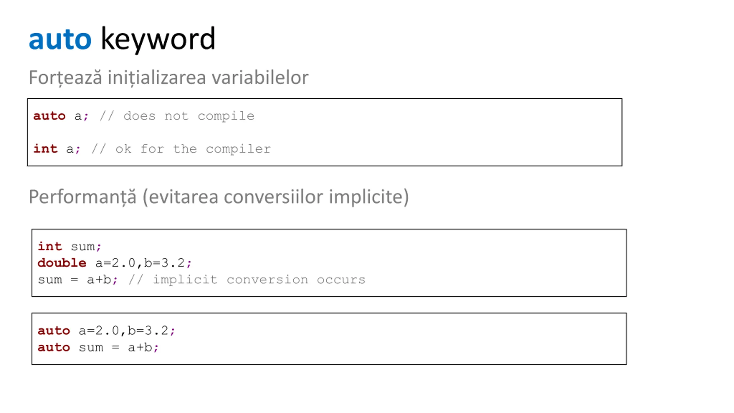 auto keyword For eaz ini ializarea variabilelor auto a; // does not compile int a; // ok for the compiler Performan (evitarea conversiilor implicite) int sum; double a=2.0,b=3.2; sum = a+b; // implicit conversion occurs auto a=2.0,b=3.2; auto sum = a+b;