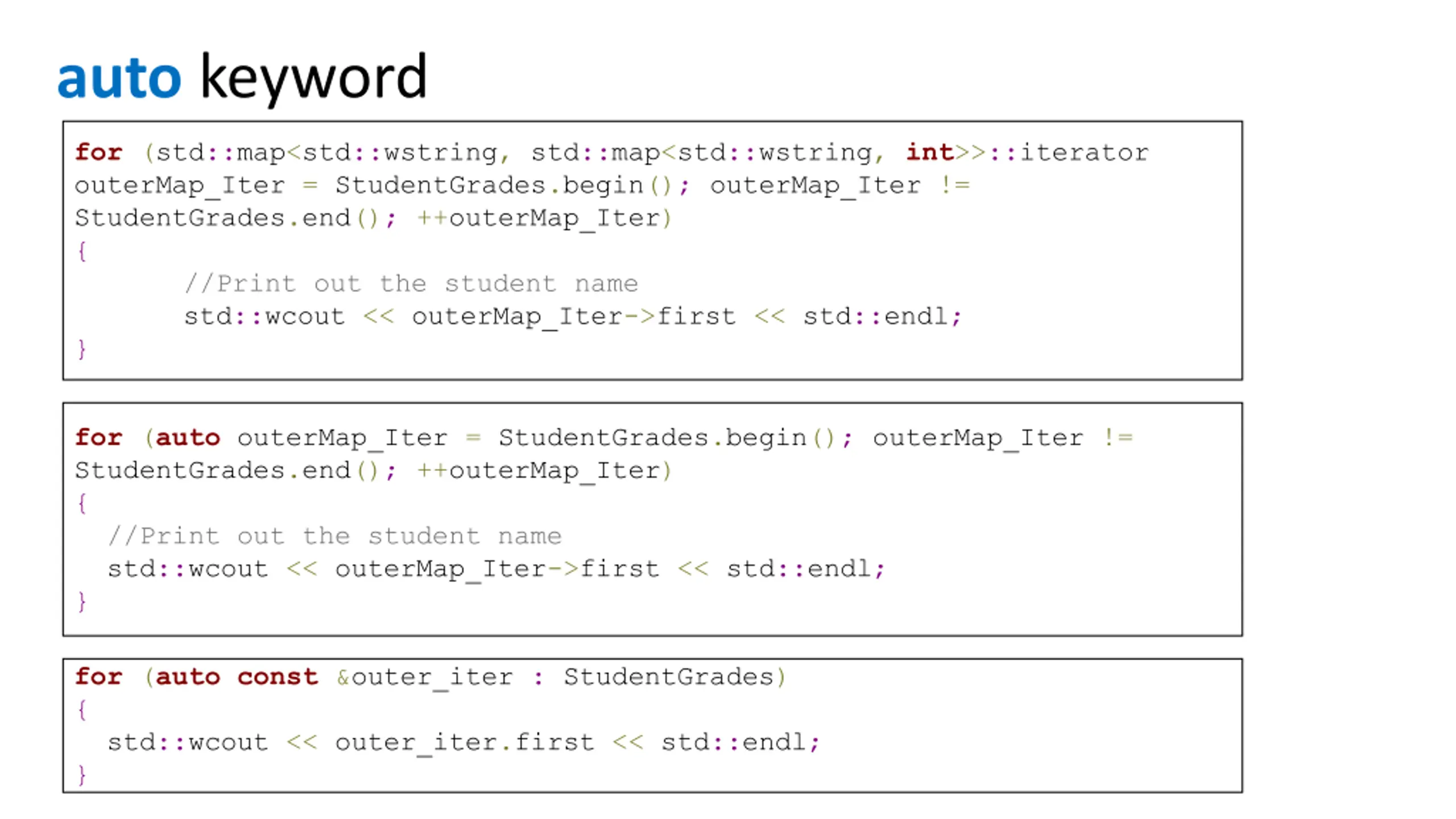 auto keyword for (std::map<std::wstring, std::map<std::wstring, int>>::iterator outerMap_Iter = StudentGrades.begin(); outerMap_Iter != StudentGrades.end(); ++outerMap_Iter) { //Print out the student name std::wcout << outerMap_Iter->first << std::endl; } for (auto outerMap_Iter = StudentGrades.begin(); outerMap_Iter != StudentGrades.end(); ++outerMap_Iter) { //Print out the student name std::wcout << outerMap_Iter->first << std::endl; } for (autoconst &outer_iter : StudentGrades) { std::wcout << outer_iter.first << std::endl; }