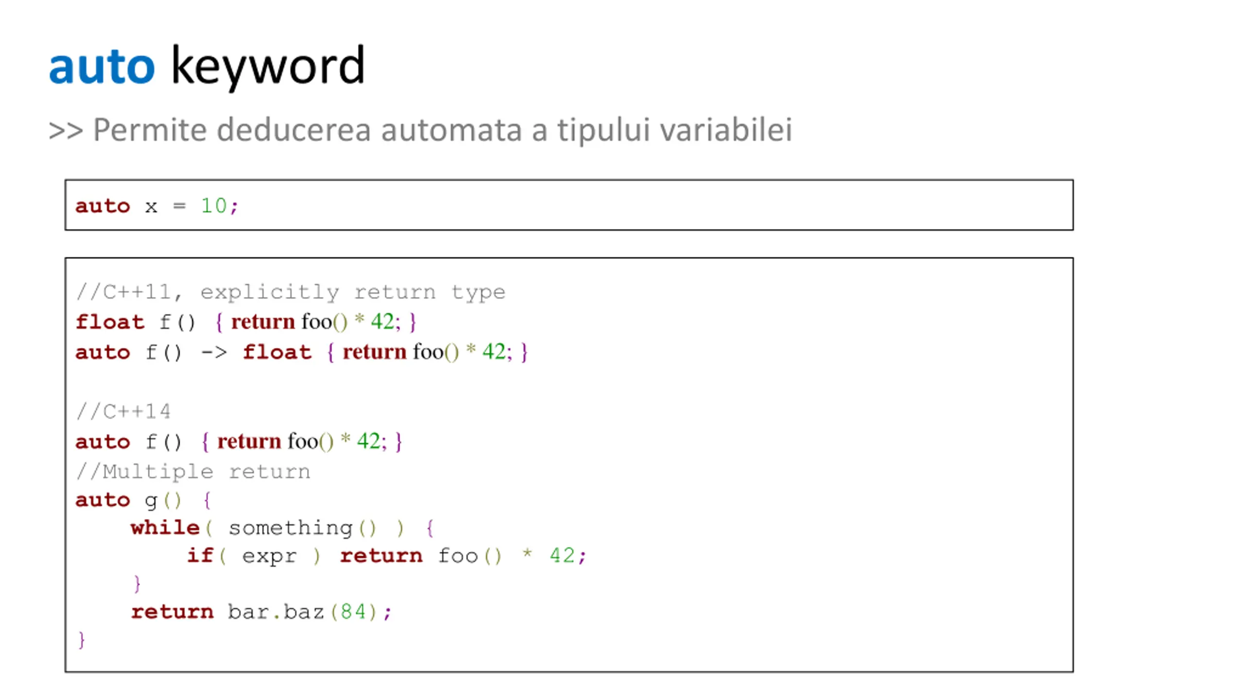 auto keyword >> Permite deducerea automata a tipului variabilei auto x = 10; //C++11, explicitly return type float f() { return foo() * 42; } auto f() -> float { return foo() * 42; } //C++14 auto f() { return foo() * 42; } //Multiple return auto g() { while( something() ) { if( expr ) return foo() * 42; } return bar.baz(84); }