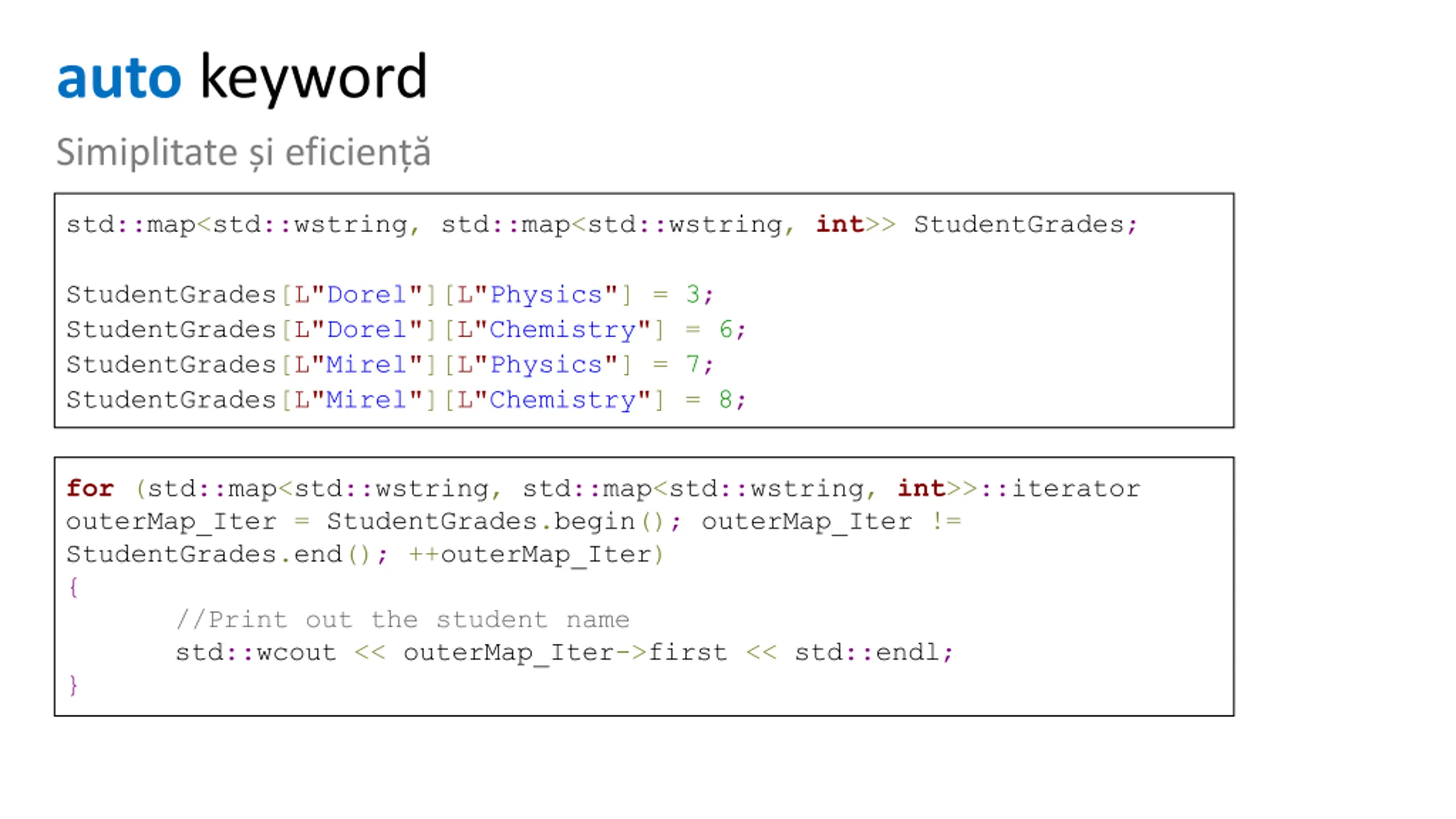 auto keyword Simiplitate i eficien std::map<std::wstring, std::map<std::wstring, int>> StudentGrades; StudentGrades[L"Dorel"][L"Physics"] = 3; StudentGrades[L"Dorel"][L"Chemistry"] = 6; StudentGrades[L"Mirel"][L"Physics"] = 7; StudentGrades[L"Mirel"][L"Chemistry"] = 8; for (std::map<std::wstring, std::map<std::wstring, int>>::iterator outerMap_Iter = StudentGrades.begin(); outerMap_Iter != StudentGrades.end(); ++outerMap_Iter) { //Print out the student name std::wcout << outerMap_Iter->first << std::endl; }