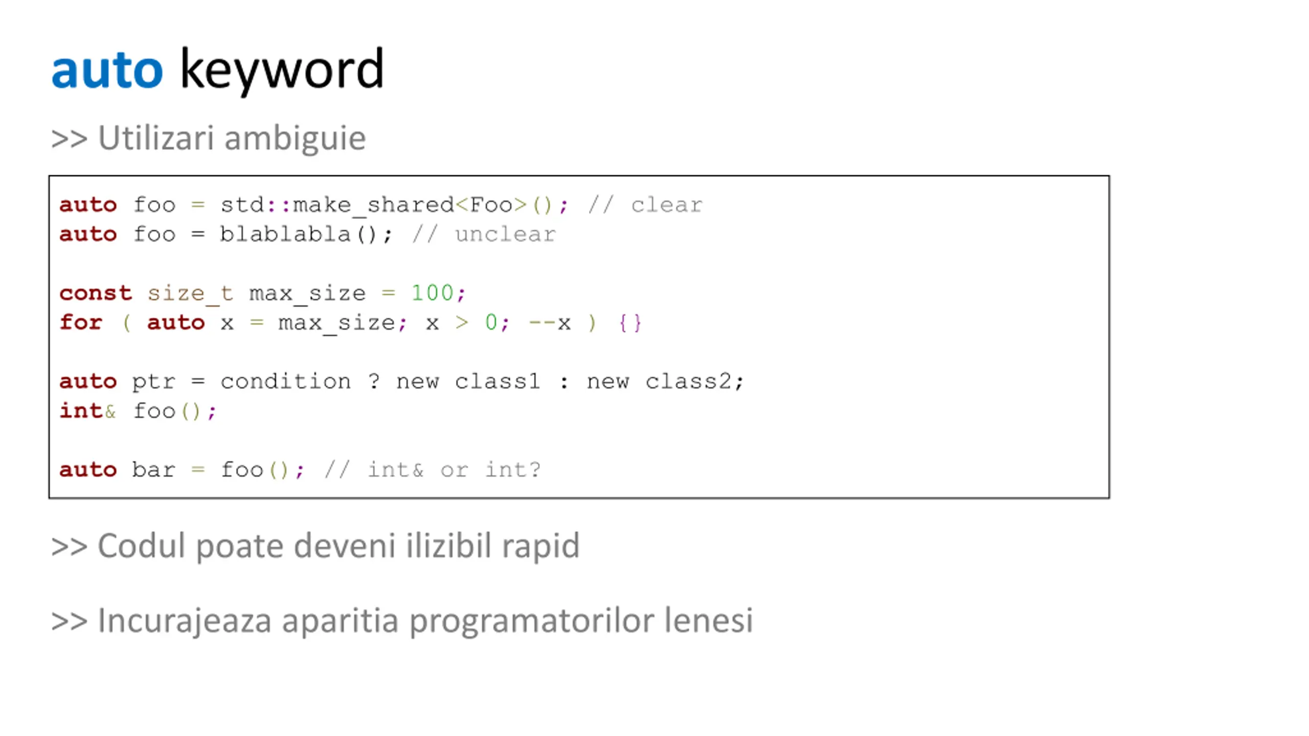 auto keyword >> Utilizari ambiguie auto foo = std::make_shared<Foo>(); // clear auto foo = blablabla(); // unclear const size_t max_size = 100; for ( auto x = max_size; x > 0; --x ) {} auto ptr = condition ? new class1 : new class2; int& foo(); auto bar = foo(); // int& or int? >> Codul poate deveni ilizibil rapid >> Incurajeaza aparitia programatorilor lenesi
