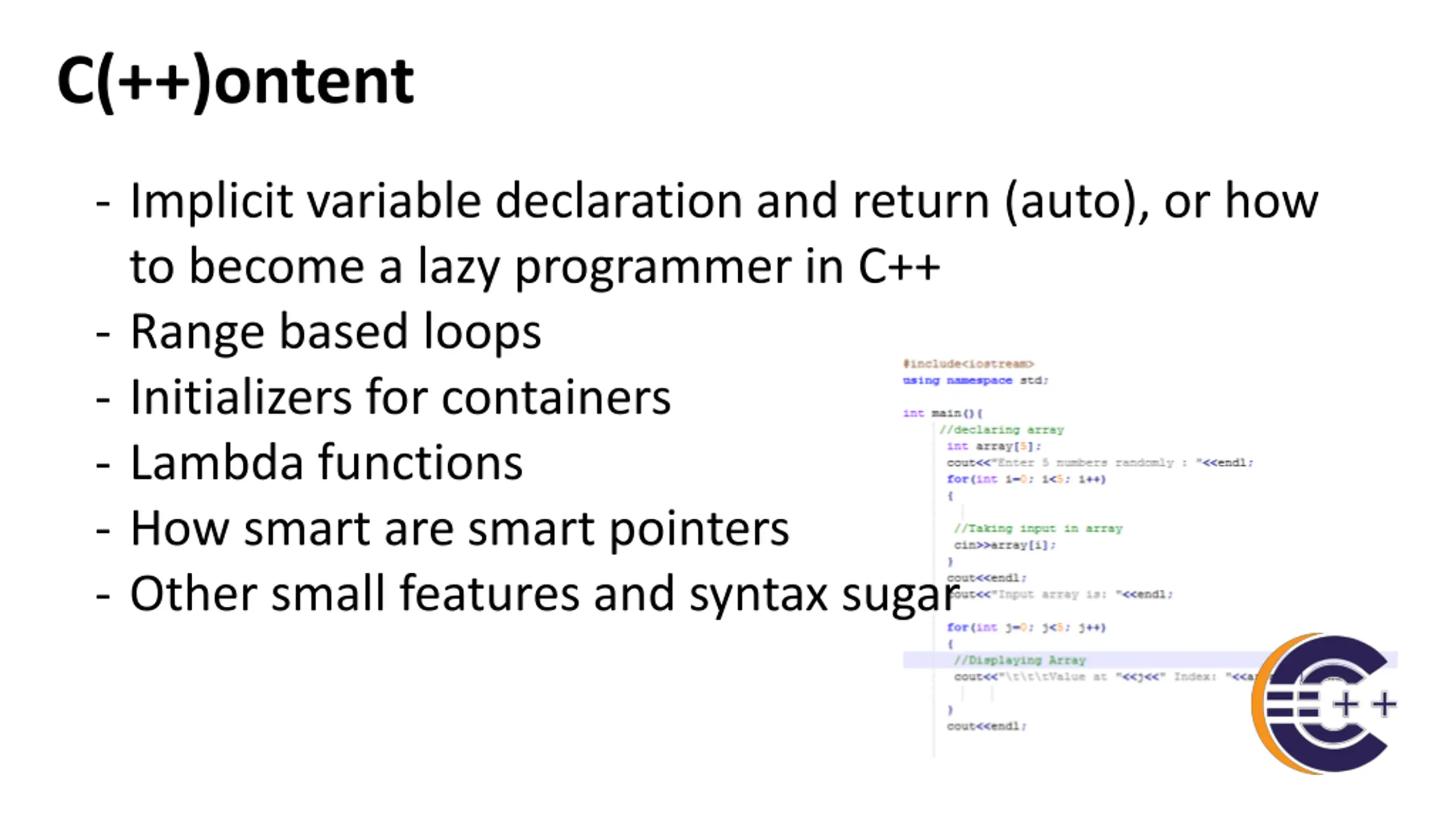 C(++)ontent - Implicit variable declaration and return (auto), or how to become a lazy programmer in C++ - Range based loops - Initializers for containers - Lambda functions - How smart are smart pointers - Other small features and syntax sugar