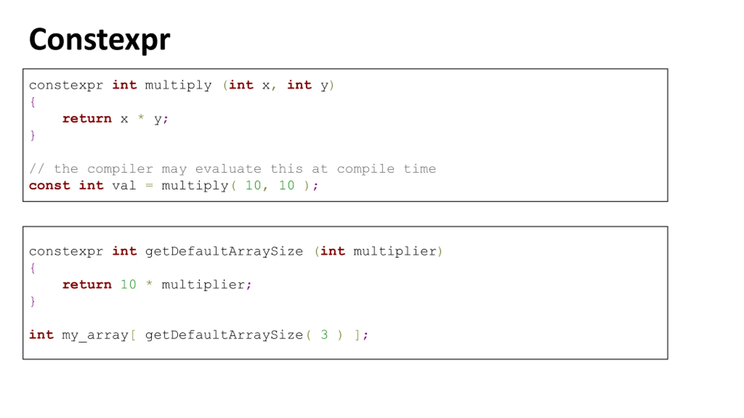 Constexpr constexpr int multiply (int x, int y) { return x * y; } // the compiler may evaluate this at compile time constint val = multiply( 10, 10 ); constexpr int getDefaultArraySize (int multiplier) { return 10 * multiplier; } int my_array[ getDefaultArraySize( 3 ) ];