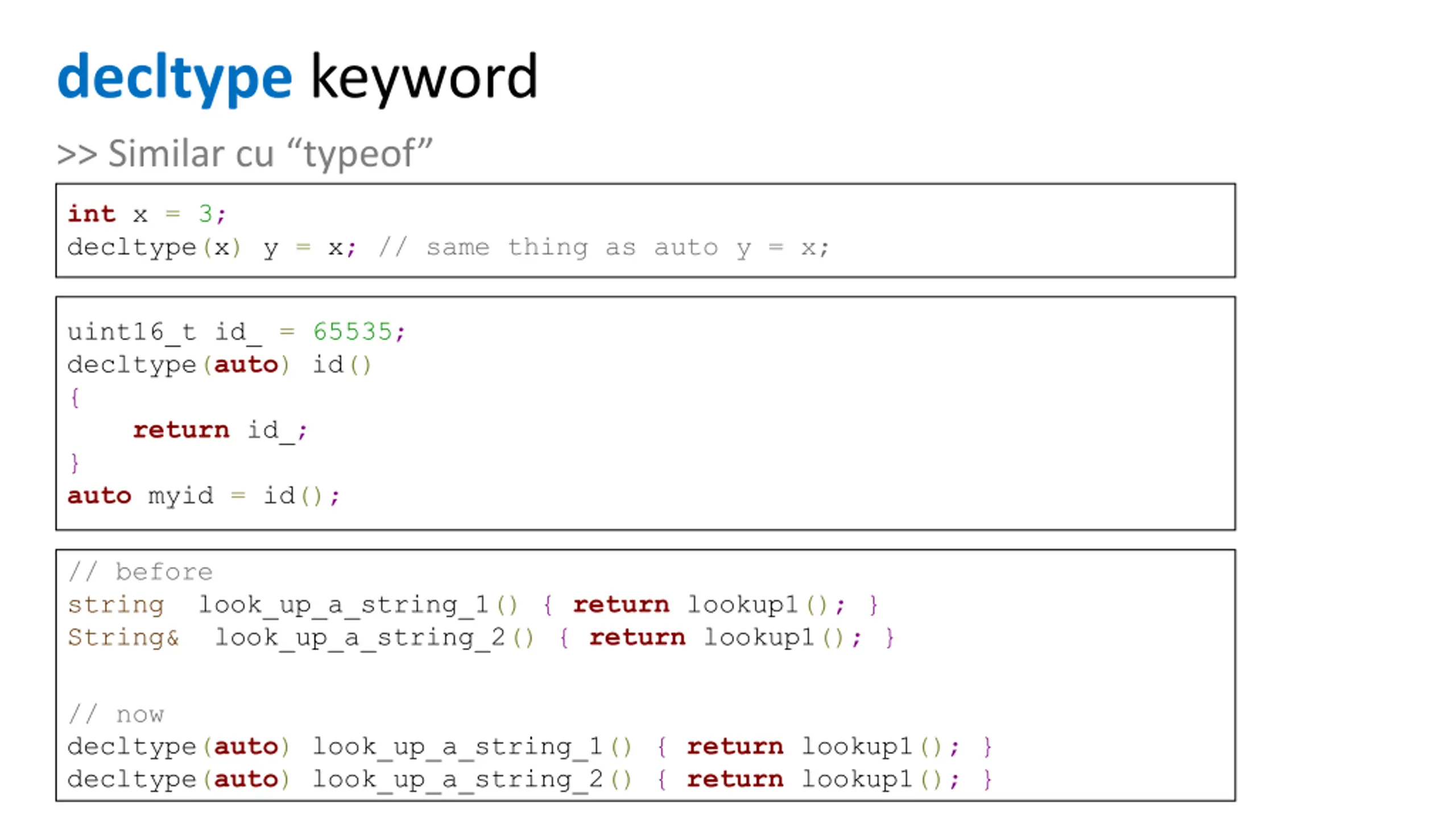 decltype keyword >> Similar cu typeof int x = 3; decltype(x) y = x; // same thing as auto y = x; uint16_t id_ = 65535; decltype(auto) id() { return id_; } auto myid = id(); // before string look_up_a_string_1() { return lookup1(); } String& look_up_a_string_2() { return lookup1(); } // now decltype(auto) look_up_a_string_1() { return lookup1(); } decltype(auto) look_up_a_string_2() { return lookup1(); }