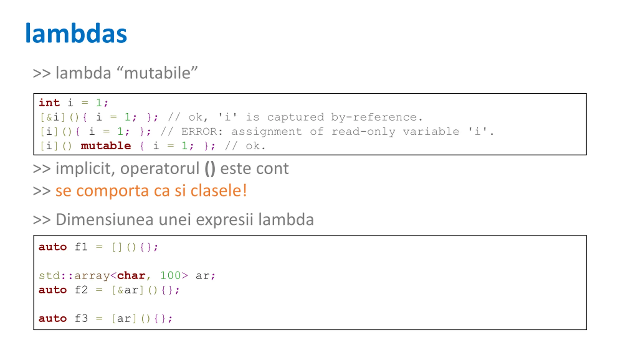 lambdas >> lambda mutabile int i = 1; [&i](){ i = 1; }; // ok, 'i' is captured by-reference. [i](){ i = 1; }; // ERROR: assignment of read-only variable 'i'. [i]() mutable { i = 1; }; // ok. >> implicit, operatorul () este cont >> se comporta ca si clasele! >> Dimensiunea unei expresii lambda auto f1 = [](){}; std::array<char, 100> ar; auto f2 = [&ar](){}; auto f3 = [ar](){};