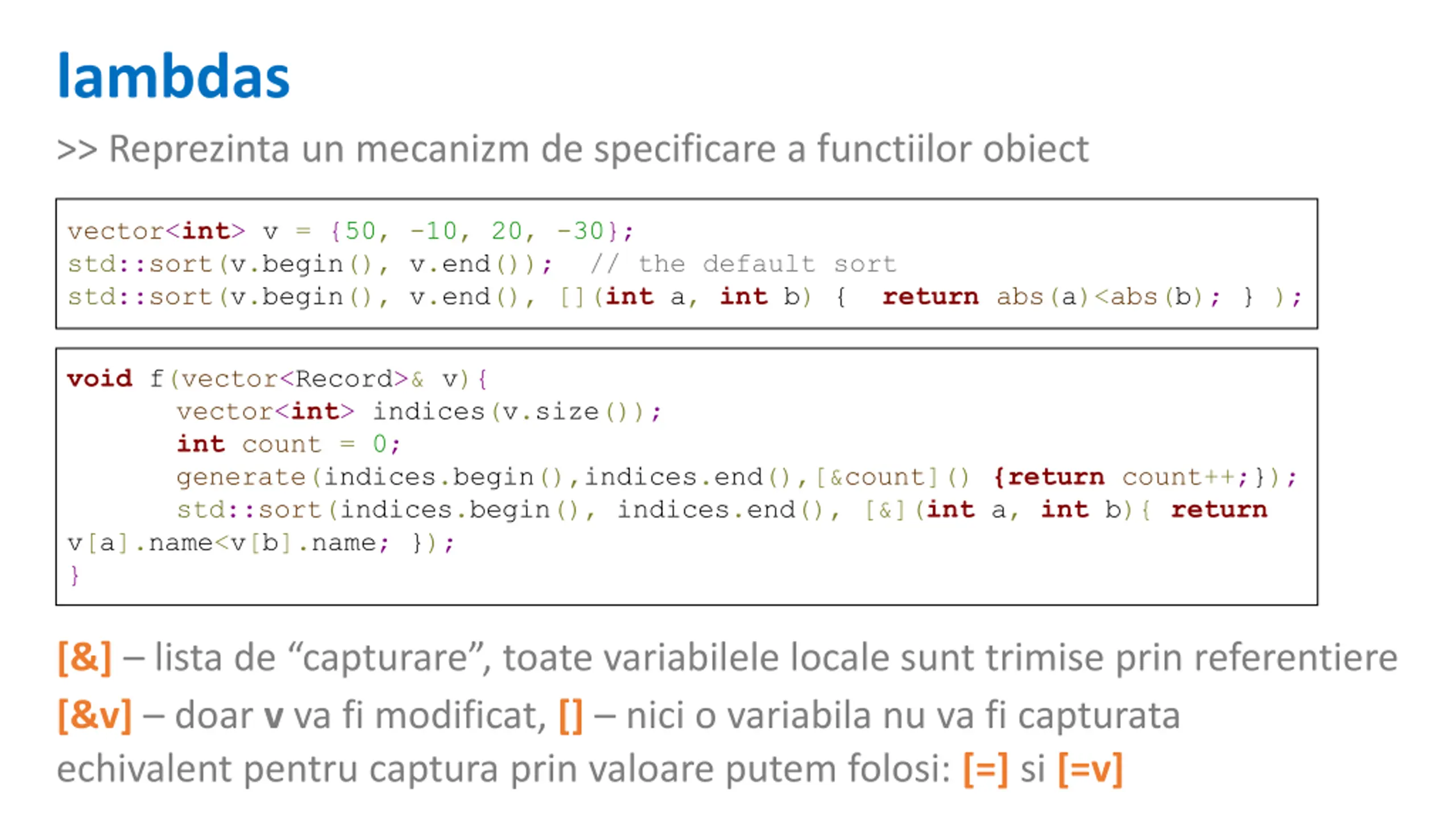 lambdas >> Reprezinta un mecanizm de specificare a functiilor obiect vector<int> v = {50, -10, 20, -30}; std::sort(v.begin(), v.end()); // the default sort std::sort(v.begin(), v.end(), [](int a, int b) {{return abs(a)<abs(b); }}); void f(vector<Record>& v){ vector<int> indices(v.size()); int count = 0; generate(indices.begin(),indices.end(),[&count]() {return count++;}); std::sort(indices.begin(), indices.end(), [&](int a, int b){ return v[a].name<v[b].name; }); } [&] lista de capturare , toate variabilele locale sunt trimise prin referentiere [&v] doar v va fi modificat, [] nici o variabila nu va fi capturata echivalent pentru captura prin valoare putem folosi: [=] si [=v]