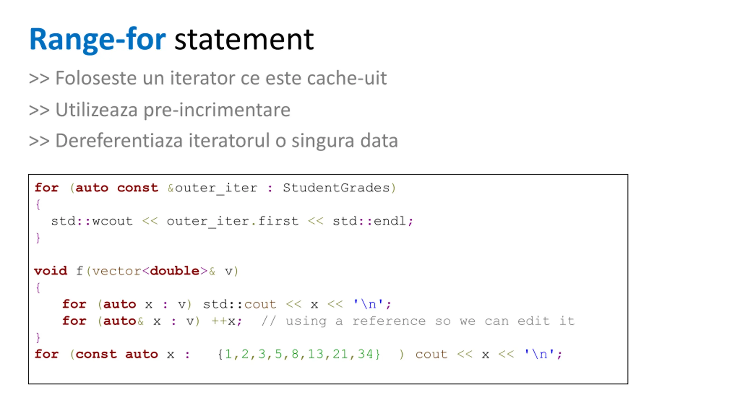 Range-for statement >> Foloseste un iterator ce este cache-uit >> Utilizeaza pre-incrimentare >> Dereferentiaza iteratorul o singura data for (autoconst &outer_iter : StudentGrades) { std::wcout << outer_iter.first << std::endl; } void f(vector<double>& v) { for (auto x : v) std::cout << x << '\n'; for (auto& x : v) ++x; // using a reference so we can edit it } for (constauto x : { {1,2,3,5,8,13,21,34} }) cout << x << '\n';