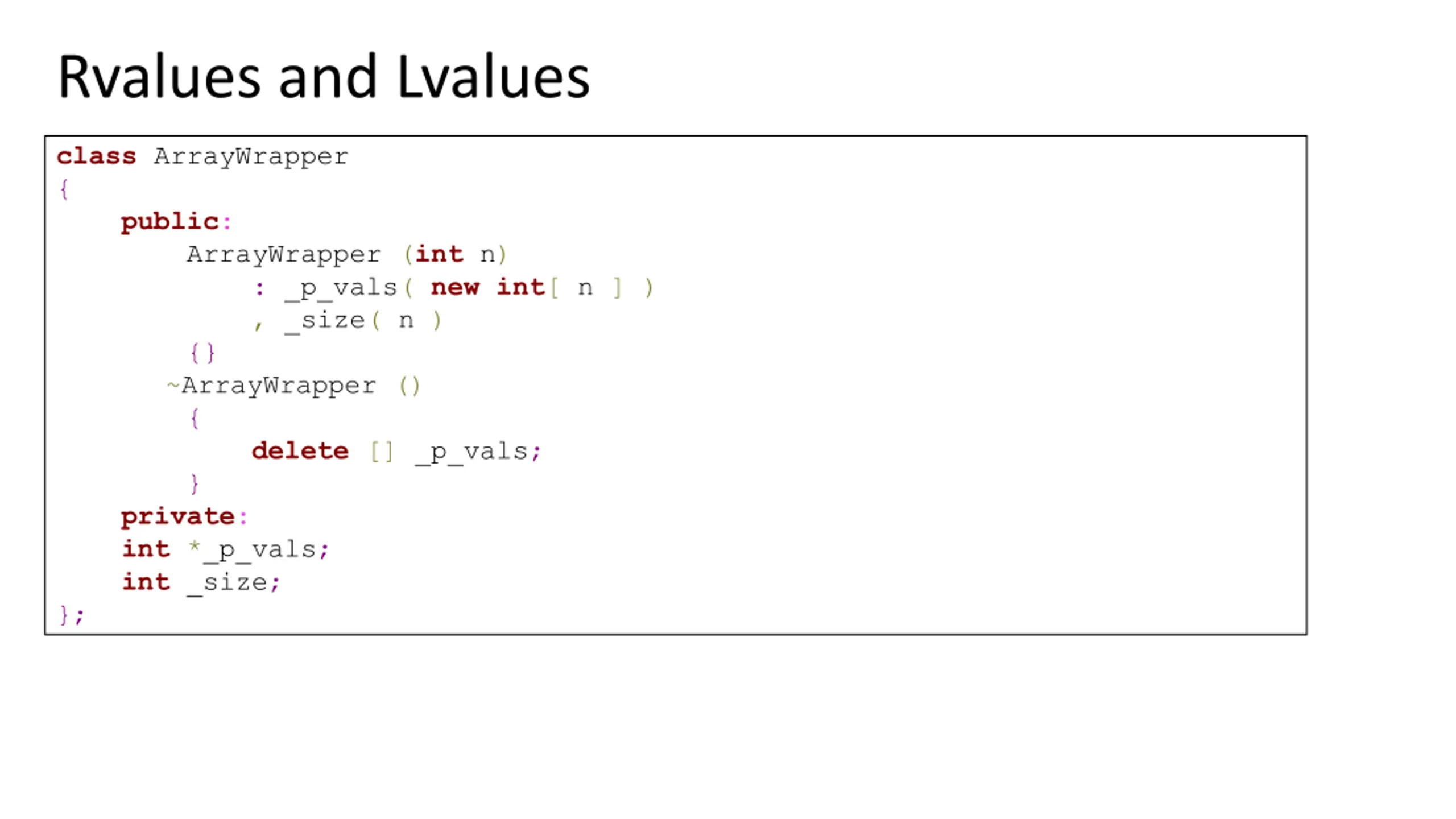 Rvalues and Lvalues class ArrayWrapper { public: ArrayWrapper (int n) : _p_vals( newint[ n ] ) , _size( n ) {} ~ArrayWrapper () { delete [] _p_vals; } private: int *_p_vals; int _size; };