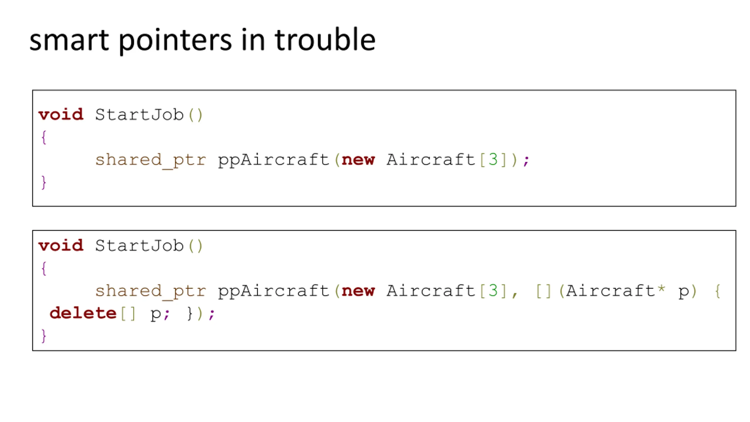 smart pointers in trouble void StartJob() { shared_ptr ppAircraft(new Aircraft[3]); } void StartJob() { shared_ptr ppAircraft(new Aircraft[3], [](Aircraft* p) { {delete[] p; }); }