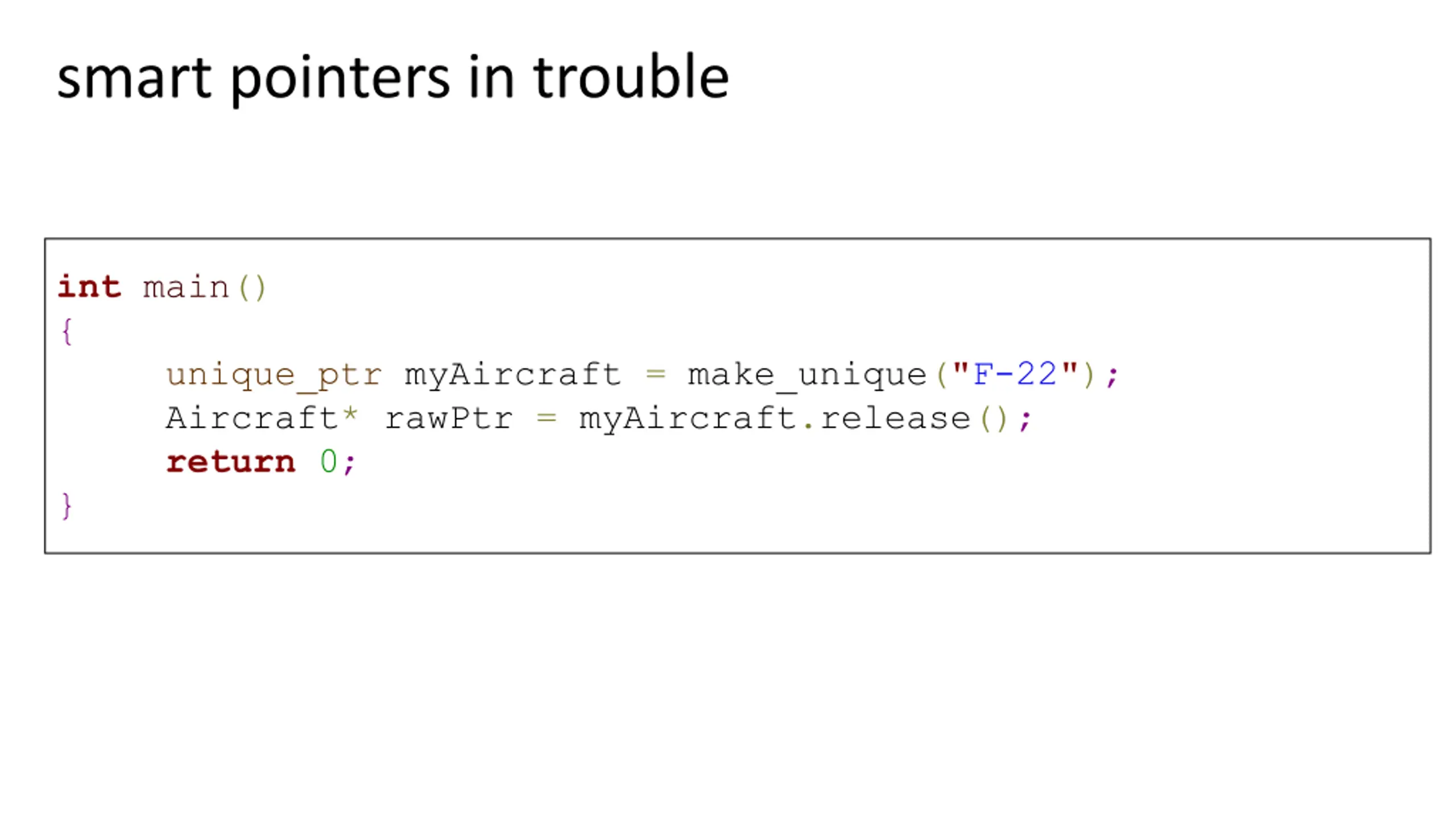 smart pointers in trouble int main() { unique_ptr myAircraft = make_unique("F-22"); Aircraft* rawPtr = myAircraft.release(); return 0; }