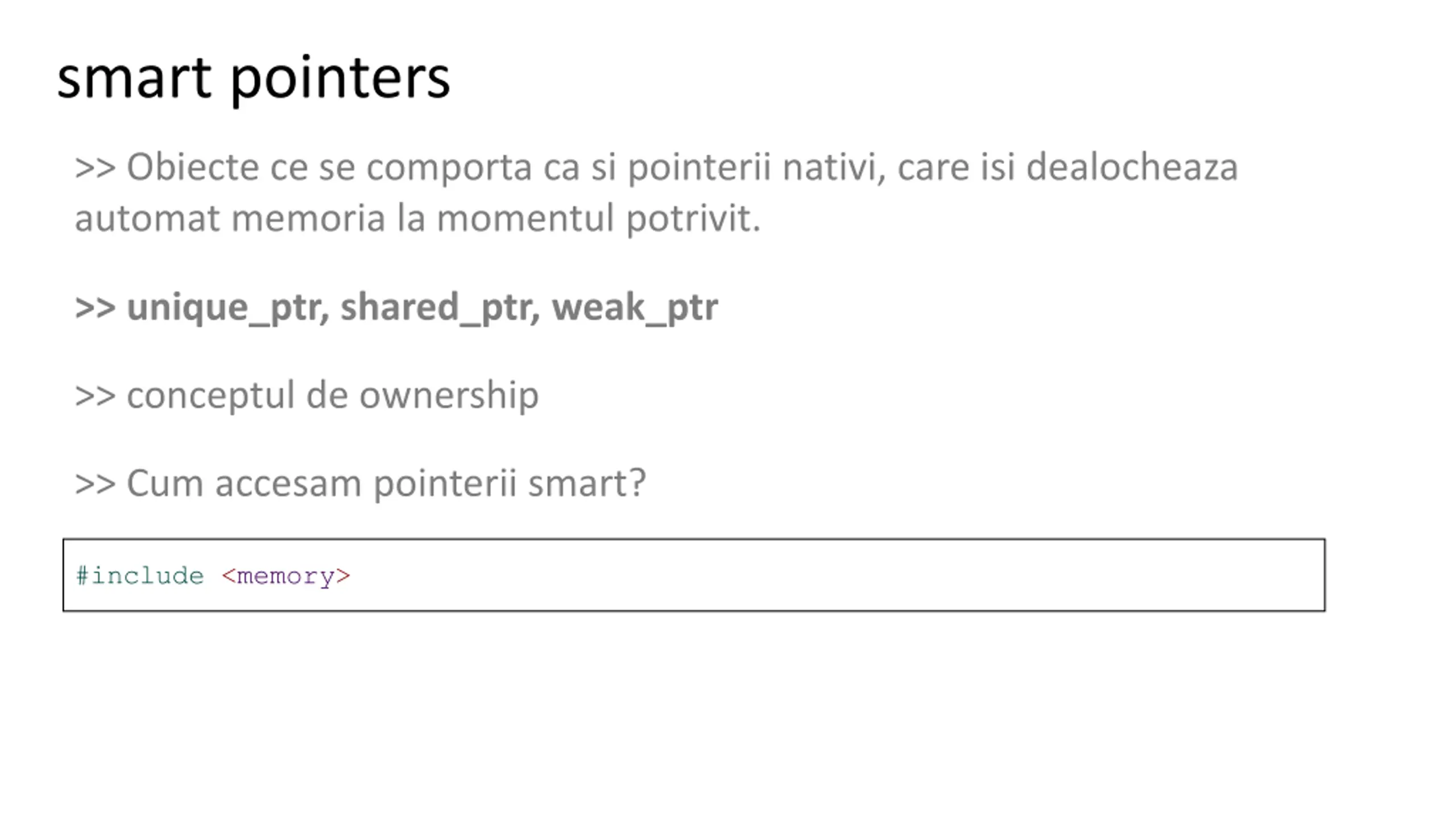smart pointers >> Obiecte ce se comporta ca si pointerii nativi, care isi dealocheaza automat memoria la momentul potrivit. >> unique_ptr, shared_ptr, weak_ptr >> conceptul de ownership >> Cum accesam pointerii smart? #include <memory>