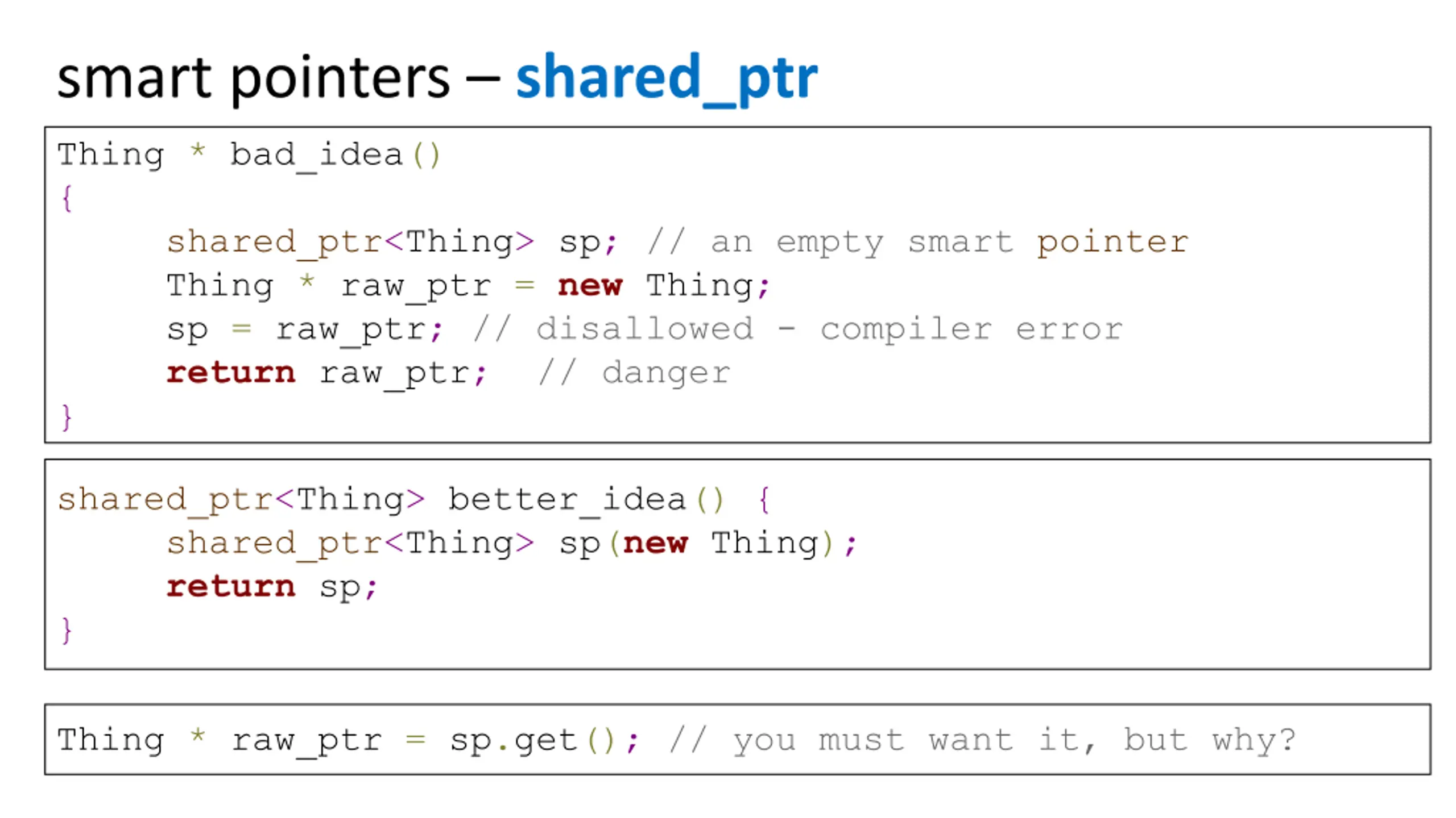 smart pointers shared_ptr Thing * bad_idea() { shared_ptr<Thing> sp; // an empty smart pointer Thing * raw_ptr = new Thing; sp = raw_ptr; // disallowed - compiler error !!! return raw_ptr; // danger } shared_ptr<Thing> better_idea() { shared_ptr<Thing> sp(new Thing); return sp; } Thing * raw_ptr = sp.get(); // you must want it, but why?